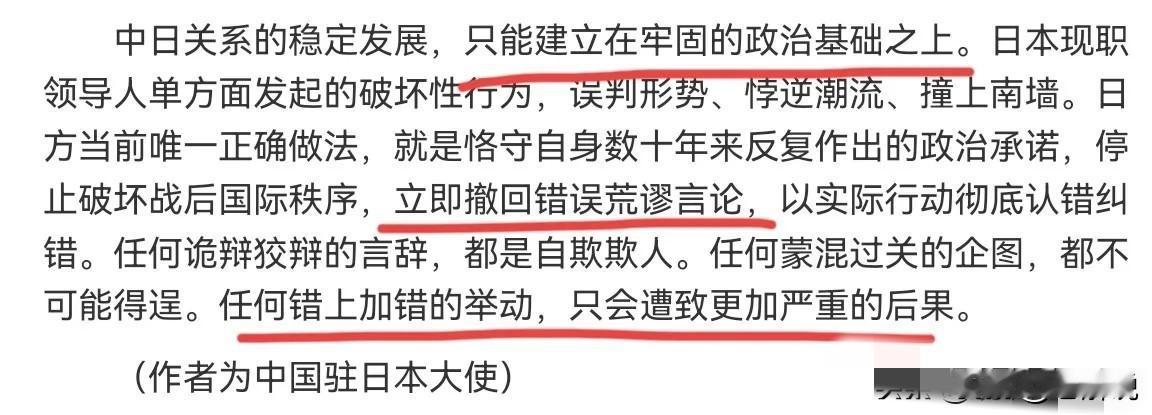 驻日大使吴江浩再次刊文了,表明了态度!11月30日,我们的驻日大使吴江浩刊文表示,中日关系的稳定发展,只能建立在牢固的政治基础之上。 核心意思很简单:中日要好好相处,必须守住该守的规矩,可现在日本现职领导人净干破坏规矩的事,既看错了形势,又逆着潮流走,最后肯定得碰一鼻子灰。首先得说清,中日关系的“政治基础”不是空口号,而是实打实的规矩,比如中日四个政治文件里定的原则,承认一个中国、正视侵略历史、遵守《开罗宣言》《波茨坦公告》这些战后国际秩序,这些是几十年前就说好的,也是两国关系能走下去的根本。 可日本现职领导人偏要往这根基上砸石头,就说最近的事,首相高市早苗公然喊“台湾有事就是日本存亡危机事态”,明着想干涉台湾问题,还敢说不接受《联合国宪章》里的敌国条款,完全忘了日本战败国的身份,之前8月15日还有内阁成员参拜靖国神社,那地方供奉着二战甲级战犯,说白了就是给军国主义招魂。 除此之外,还忙着扩军,提前把防卫预算提到GDP的2%,放宽武器出口限制,甚至想改“无核三原则”,一步步突破和平宪法的束缚,这些行为全是在拆中日关系的台,也在挑战战后的国际秩序。 再说日本这波操作纯属误判形势,简直没看清自己几斤几两,以为抱上美国的大腿就能肆无忌惮挑衅,却忘了中国早就不是当年的样子,捍卫主权的决心和能力根本不容小觑。 中方一出手,不管是法理上亮明底线,还是经济上精准反制,都打在日本的软肋上,日本经济压根离不了中国,官方数据显示,日本有1406个品类的超一半进口额来自中国,小到日常用品,大到制造业需要的稀土,83%的稀土都得从中国买,高端产业根本耗不起。 之前高市涉台言论一出,中国游客赴日订单就崩了,30个年底旅游团取消,旅游巴士公司光损失就两三千万日元,资生堂、优衣库这些日企股价跟着跌,农渔业更是亏了超5000亿日元,本就负增长的日本经济雪上加霜。 这就是他们误判形势的直接代价,日本现职领导人的做法完全悖逆潮流,现在国际社会都盼着和平稳定,可他们一门心思复活军国主义,扩军备战、美化侵略历史,不仅中韩这些曾遭侵略的国家高度警惕,韩国外交部多次表达不满,俄罗斯也明确反对,连东盟国家都担心地区动荡。 就算在日本国内,反对声也越来越大,东京市民搞烛光游行抗议政客参拜靖国神社,前首相鸠山由纪夫痛批政府行错方向,甚至有日本律师调查发现,赞成自卫队介入台海的民众才12%,可见这种破坏和平的行为根本不得人心,纯属逆着大势走。 现在日本已经明显撞上南墙了,外交上被孤立,想在国际上找支持根本没人响应;经济上损失惨重,企业、从业者怨声载道;国内反对声浪越来越高,高市内阁支持率一路下滑。 吴江浩大使的话就是明确的警告,也是给日本指了明路:想让中日关系稳下来,唯一的办法就是赶紧收回那些错误言论,守住之前的承诺,停止搞军国主义那套,别再干破坏规矩的事。 要是还执迷不悟,继续瞎折腾,只会损失更惨重,被国际社会彻底看清真面目。说到底,中日相处的道理很简单,守规矩才能共赢,破规矩必然碰壁,日本现职领导人要是连这点都想不通,最后只会搬起石头砸自己的脚。