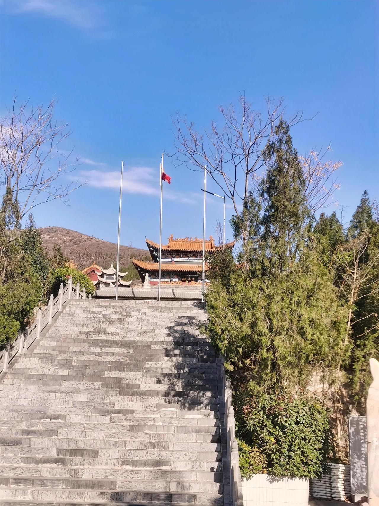 冬日的风裹着山的清冽,漫过石阶的凉。我拾级而上,每一步都惊起落叶碎响,灰石缝里还蜷着几星未化的霜。 檐角的铜铃在风里轻晃,红瓦在蓝天下淌着暖光,国旗垂着,像在听山的默想。松柏把影子揉碎在阶上,远处的山梁裸着褐色脊梁,却让这寺更像嵌在冷冬里的一方暖阳。 风掠过衣领时,忽然懂了古人说的“山静日长”——原来心一慢下来,连石阶的凉,都能酿成妥帖的时光。