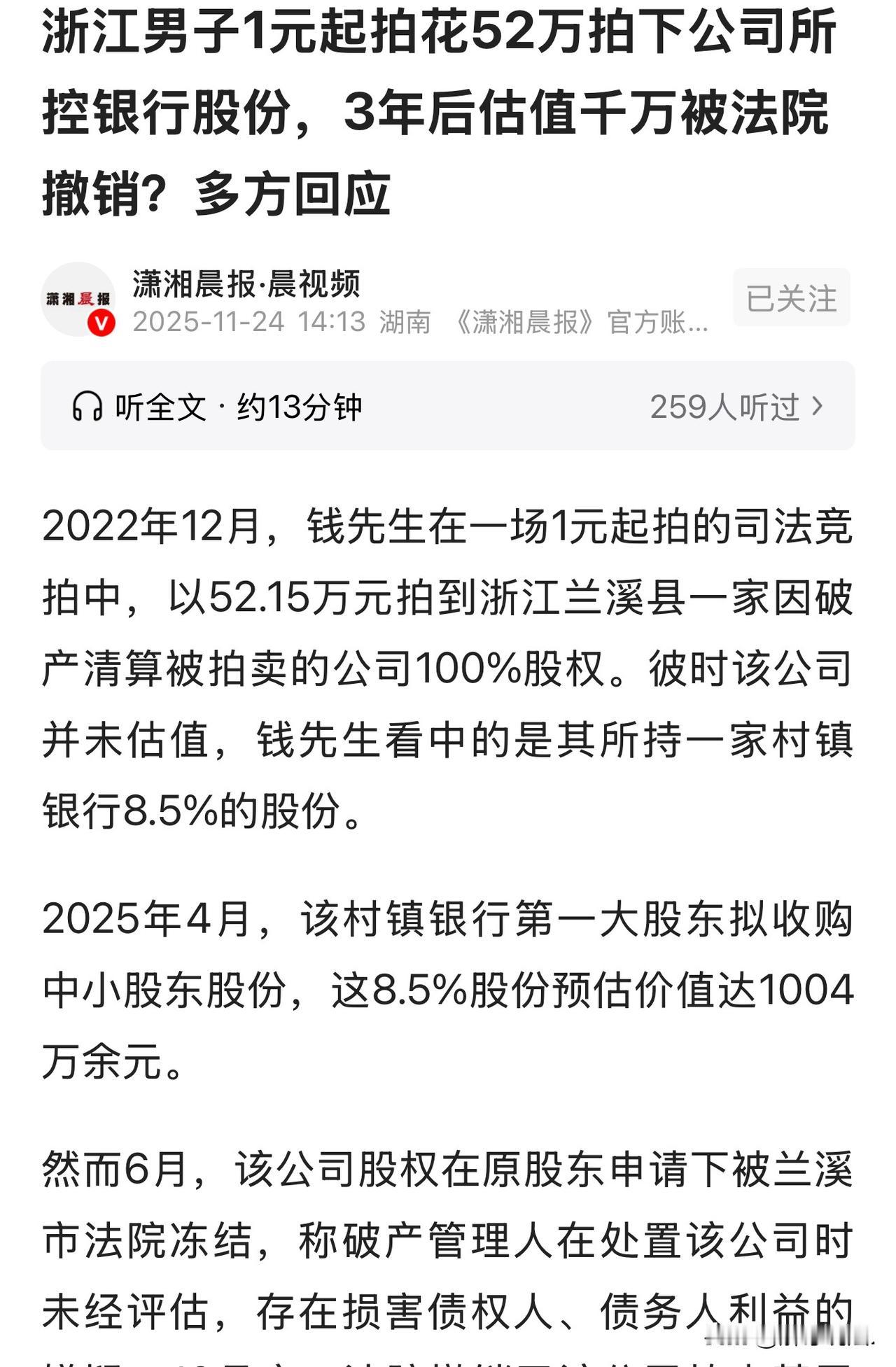 浙江,男子听说一公司宣布破产,要进拍卖,他敏锐的嗅觉到商机,决定参与拍卖,虽然当日是以一元起拍,但有15位竞争者参与其中,通通层层博弈,男子最终以52万元拿下全部股权。岂料,3年后,经专业人评估:股权中8.5%的村镇银行股份估值超1004万!这时候,原公司股东坐不住了,认为以1块钱起拍,违背了公平公正原则,向法院起诉,要求撤销拍卖。法院竟支持了其诉求,把男子名下股份变更到原股东名下。 2025年11月5日,钱先生看着手机发来的信息,自己名下兰溪嘉宝化工有限公司100%股权,已变更回原股东名下。 他万万没想到,他期待的3年的红利,到头来空欢喜一场。 到嘴的肉硬生生的吐出来,这滋味甭提多不好受了。 事情还要从2022年年底说起。 钱先生听到一个消息,兰溪有家叫嘉宝化工的公司要进行司法拍卖,拍卖的是公司100%的股权。 常年在商场摸爬滚打,钱先生敏锐的嗅觉到了这其中的商机。 他坐不住了,赶紧通过关系去调查这家公司的底细。 结果不出他所料,这块肥肉,已经被很多人盯上了。 原来,兰溪嘉宝化工早就不行了,已经陷入破产清算,公司基本就是个空壳子。 但这家公司手里握着一张“王牌”,越商村镇银行8.5%的股份。 银行股份可不是一般的资产,流动性强,保值增值能力也靠谱,只要竞拍价格合适,这绝对是一笔稳赚不赔的买卖。 他当即拍板,一定要拿下这笔股权。 可是这场拍卖大战,比他预期的还要激烈,有15位竞争者参与,但钱先生做好了势在必得的决心。 这场拍卖仅1元钱起价,之所以以这么低的价格,是因为嘉宝化工的股权之前已经进行过两次高价拍卖,结果都因为价格太高没人接手,流拍了。 竞拍当日,钱先生抱着必胜的信念,一次次手动加价,和其他竞争者你来我往,互不相让。 这场竞拍足足持续了好几个小时,每一轮竞价都是一次心理博弈。 最终,经过整整698轮的激烈角逐,钱先生以52.15万元的价格,成功杀出重围,拿下了兰溪嘉宝化工有限公司100%的股权。 钱先生相信,这份股权,未来一定会有很大的升值空间,有大把的红利等着自己拿,同时他相信,那一天不会让他等太久。 果然,在2025年4月,就传来了好消息,专业人士给兰溪嘉宝化工有限公司持有的越商村镇银行8.5%股份做了次专业估值,最终算出的数字让所有人都瞪大了眼睛,竟高达1004万余元。 也就是说钱先生花了52.15万的成本,翻了将近20倍。 钱先生虽然料股份会增值,但没想到是这个数字,这让他心里泛起一阵狂喜。 然而,这个消息一出,有人坐不住了。 这个人就是嘉宝化工的原股东之一的徐某。 他得知股权估值后,当场就炸了,直言当初嘉宝化工破产清算、股权拍卖的时候,他根本不知道这8.5%的银行股份这么值钱! 他认为当初没对公司资产做正规评估的情况下,以1块钱起拍,是完全违背了公平公正的原则。 于是,一纸诉状把相关方告上了法庭,核心诉求只有一个:撤销当初那场司法拍卖。 钱先生一开始没把这事放在心上,他觉得自己是通过正规司法竞拍拿到的股权,程序合法,手续齐全,徐先生的诉求根本站不住脚。 可让他没想到的是,兰溪市法院经过一番审理,还真就支持了徐某的说法。 《企业破产法》相关条款奠定核心依据:该法虽未直接规定未估值不得拍卖,但处置破产财产需遵循“价值最大化”原则。同时结合多地法院破产财产处置办法,处置股权这类重大财产,需优先通过评估等方式确定参考价。 8.5%的银行股份是嘉宝化工的核心资产,属于重大财产范畴,破产管理人未做正规估值就以1元起拍,明显违背“实现债务人财产价值最大化”的核心要求,也未履行合理的资产核查义务。 2025年10月31日,法院判决,撤销兰溪嘉宝化工有限公司100%股权的司法拍卖。 钱先生彻底懵了,他怎么也想不通,一场已经尘埃落定三年的拍卖,怎么说撤销就撤销了? 自己难道做了一场白日梦,就在钱先生不能接受这个判决的时候。 也就是6在日后,钱先生就接到了通知,自己名下的股权已经变更到了原股东名下,出现了文章开头那一幕。 如今,钱先生下定决心要维权到底。 《最高人民法院关于人民法院网络司法拍卖若干问题的规定》第31条提供直接支撑:该条款明确司法拍卖中,若拍卖财产的瑕疵说明、信息公示等存在问题,导致利害关系人权益受损,利害关系人可申请撤销拍卖。 本案中,破产管理人未估值就拍卖,等同于未如实披露资产的真实价值这一关键信息,法院撤销拍卖是有法律依据的。 那是不是,钱先生只能干吃这个哑巴亏了? 当然不是,钱先生可以向法院申请国家赔偿,赔偿范围包括竞拍款本金及同期利息等直接损失。