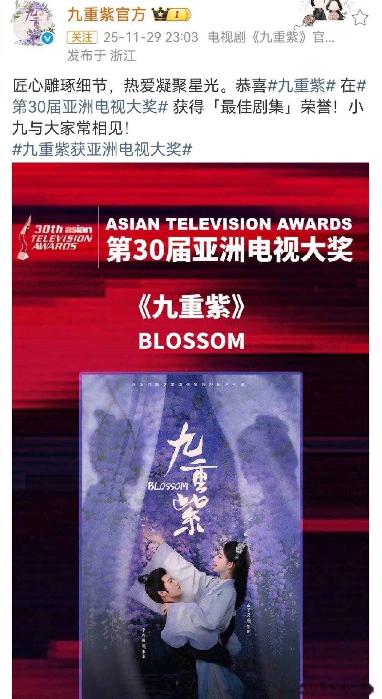 孟子义、李昀锐《九重紫》获得亚洲电视大奖最佳剧集奖项