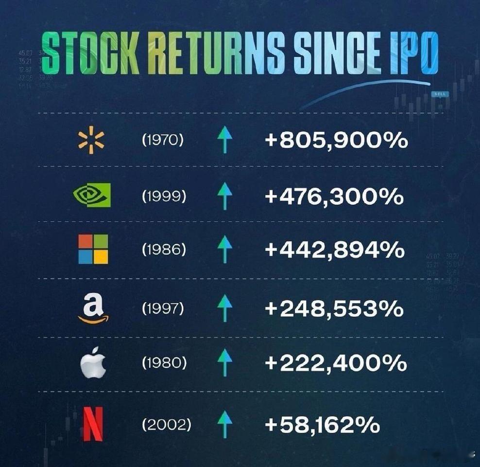 美股翘楚:IPO后惊人的股票回报率从数据来看,这些知名企业自IPO以来取得了令人瞩目的股票回报率:沃尔玛 (1970年上市): +805,900%,表现最为出色英伟达(1999年上市): +476,300%,科技股中的佼佼者微软 (1986年上市): +442,894%,软件行业的领军企业零售与物流巨头Costco (1985年上市): +54,750%FedEx (1978年上市): +38,084%科技创新企业苹果 (1980年上市): +222,400%特斯拉 (2010年上市): +20,280%谷歌 (2004年上市): +6,174%新经济代表亚马逊 (1997年上市): +248,553%星巴克 (1992年上市): +29,245%奈飞 (2002年上市): +58,162%我们国内是多少?