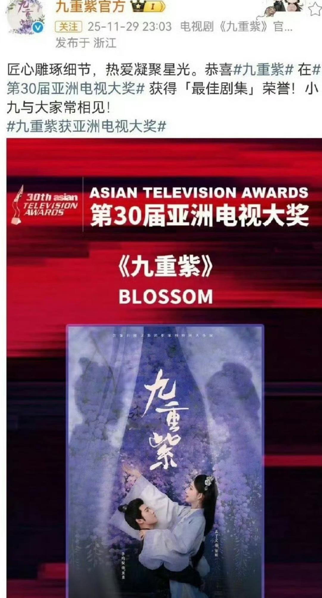 孟子义李昀锐九重紫拿下亚洲电视大奖最佳剧集。火爆海内外,恭喜!!!🎉