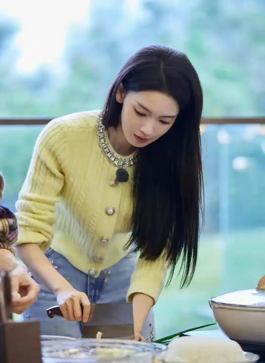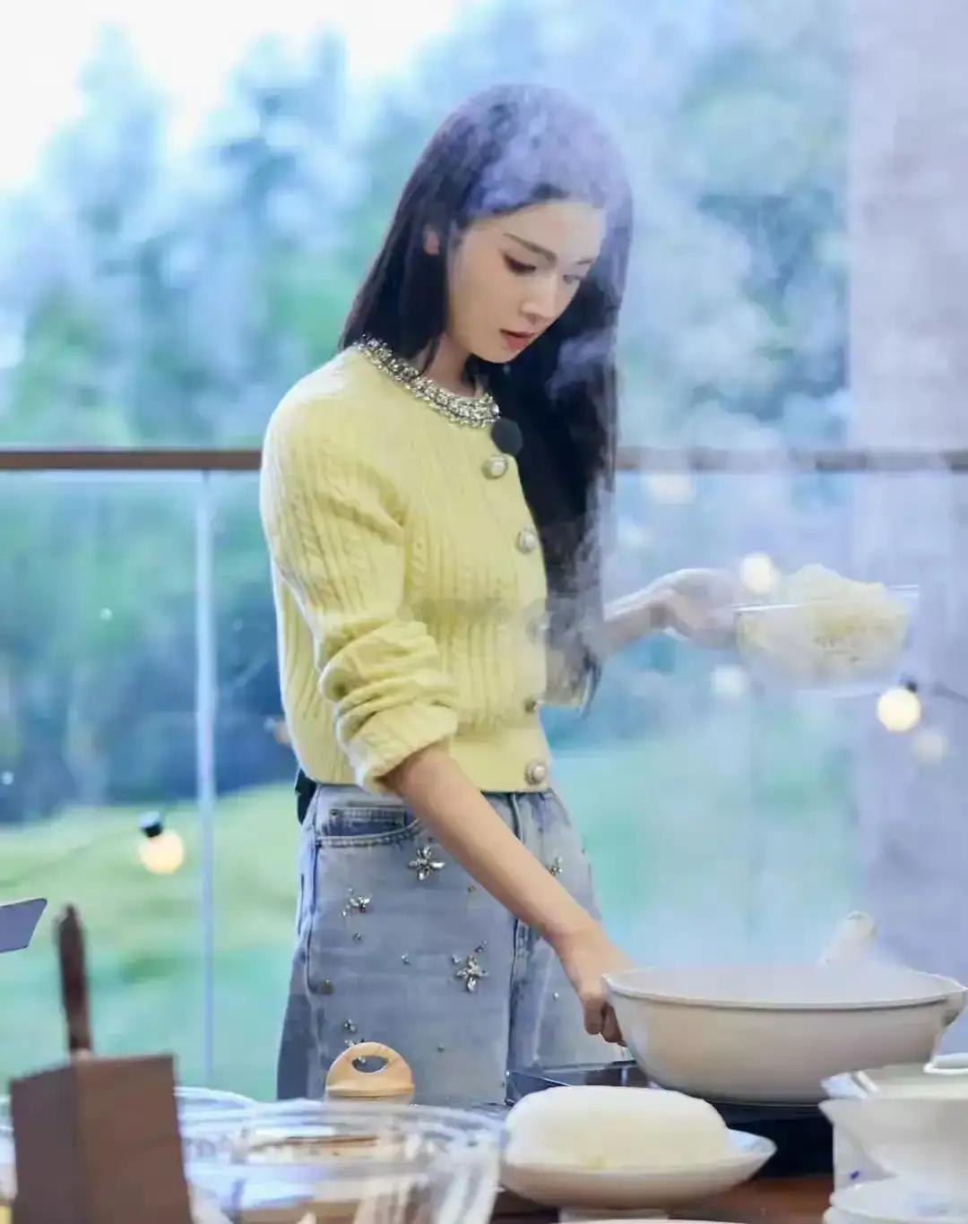 31岁的陈瑶一身暖黄小衫配牛仔裤,在厨房动作娴熟温柔,满是贤妻良母的温婉气息,格外动人。