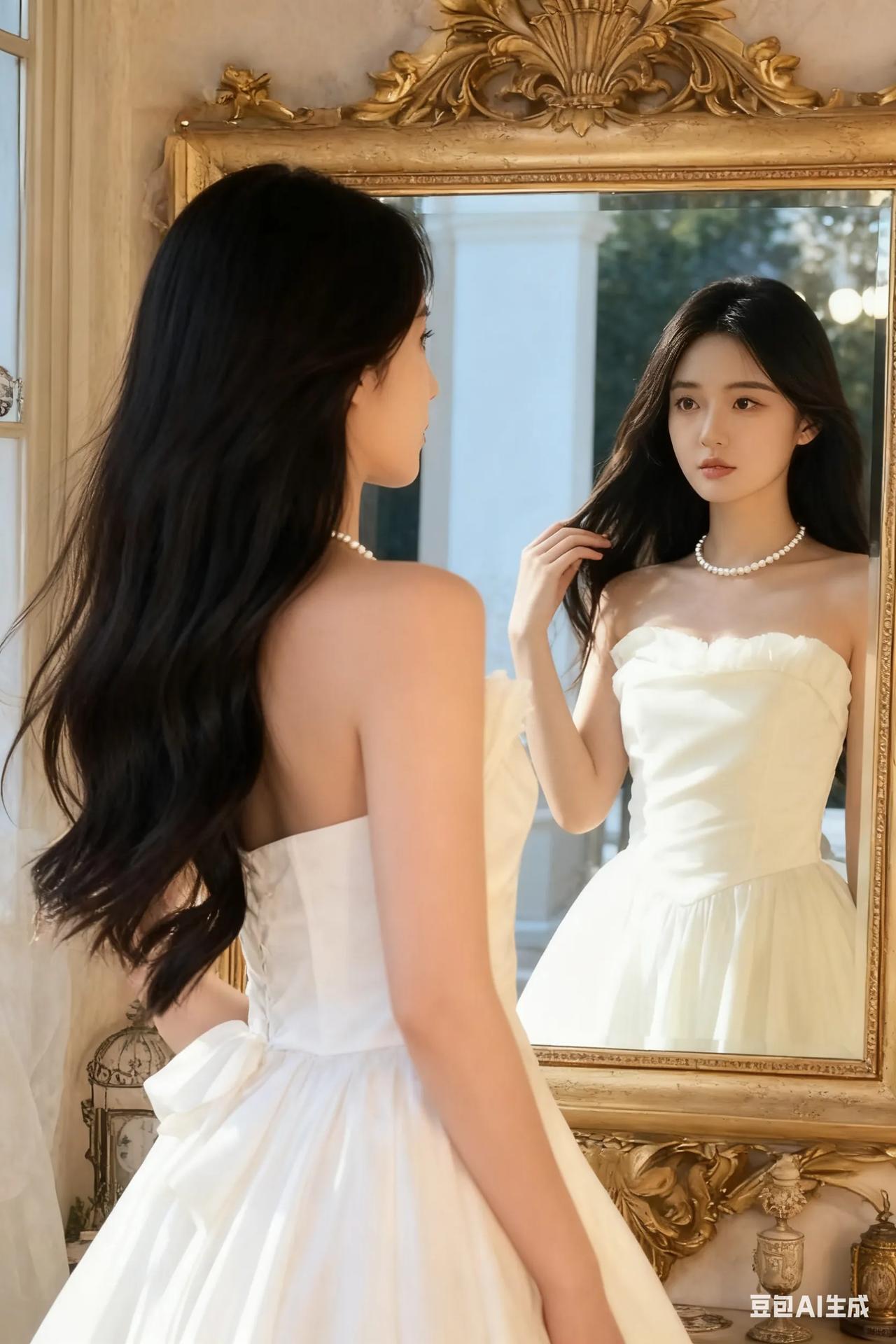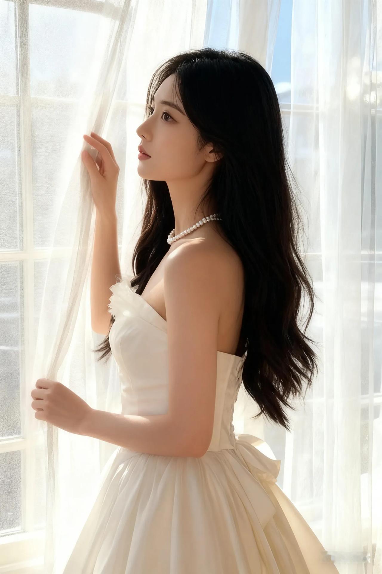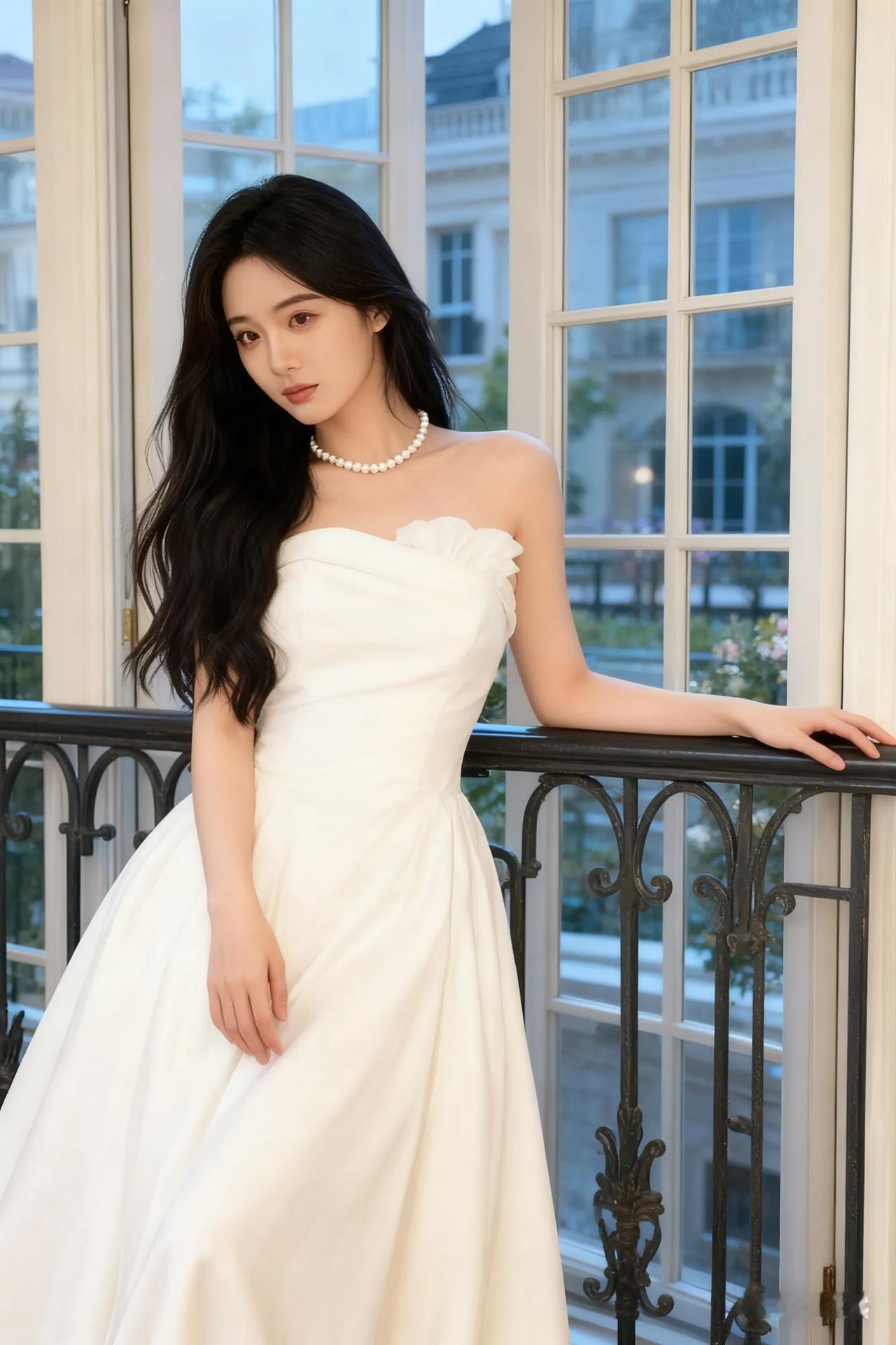 优雅白裙少女,倚栏望远方,珍珠项链点缀,梦幻如画。
