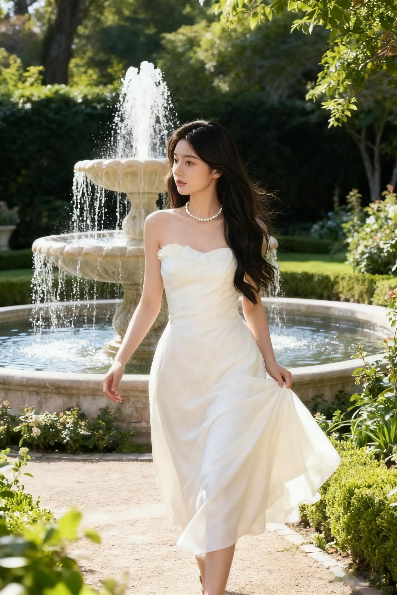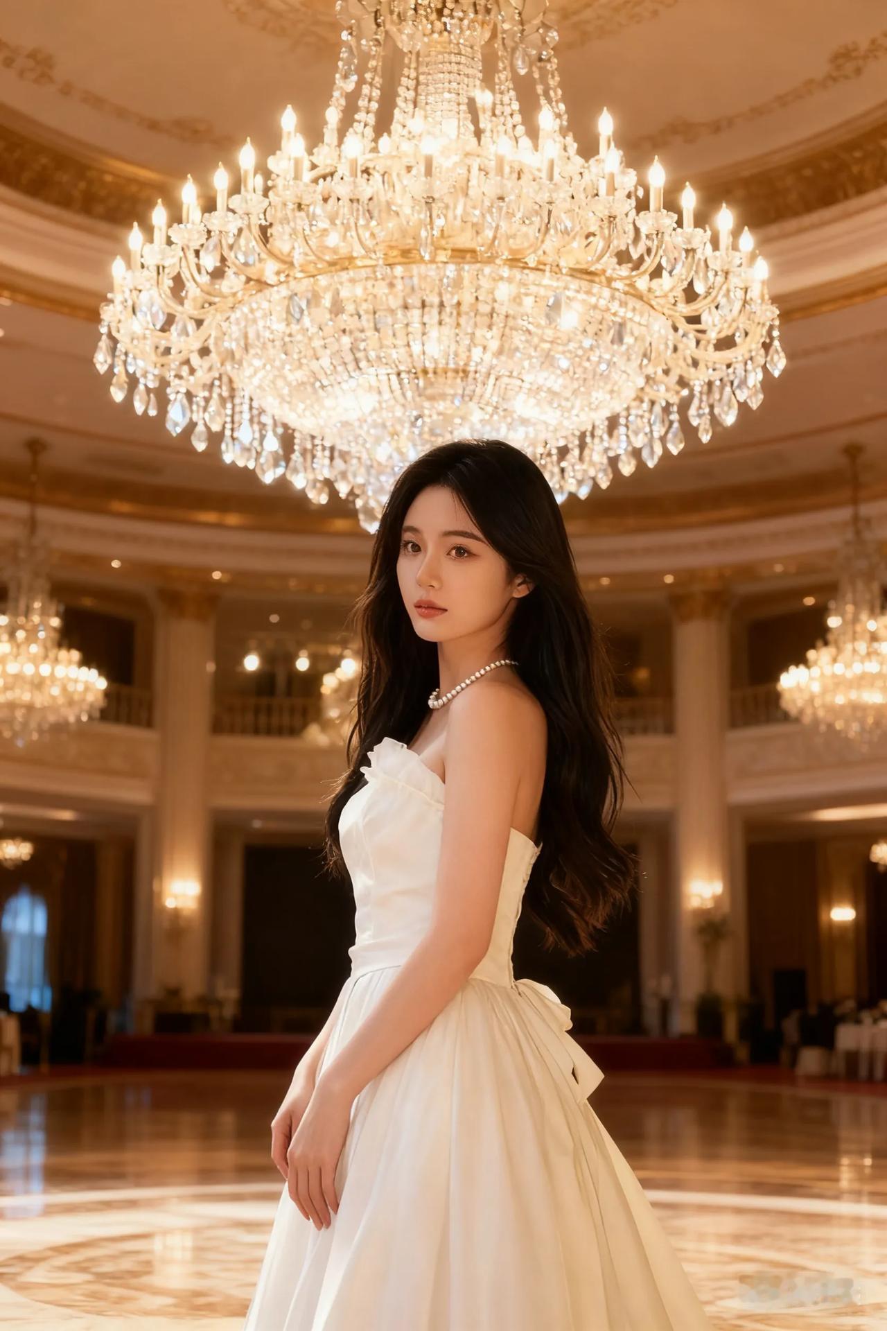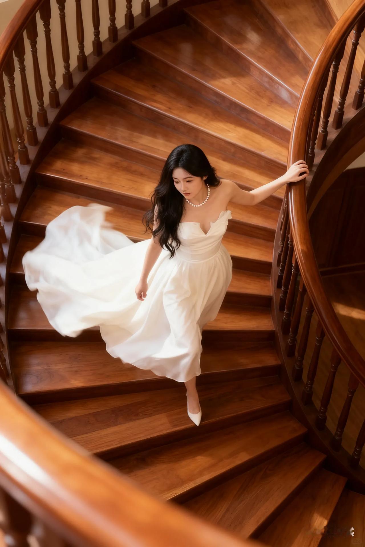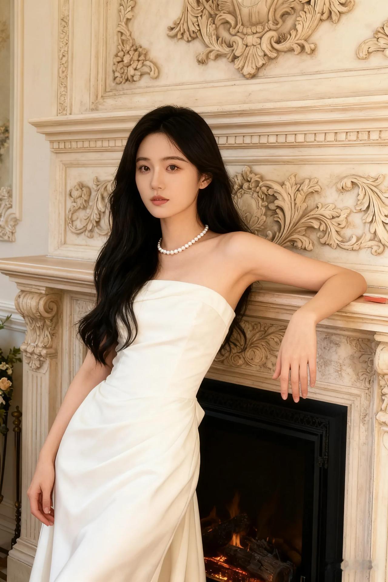 优雅白裙少女,倚栏望远方,珍珠项链点缀,梦幻如画。