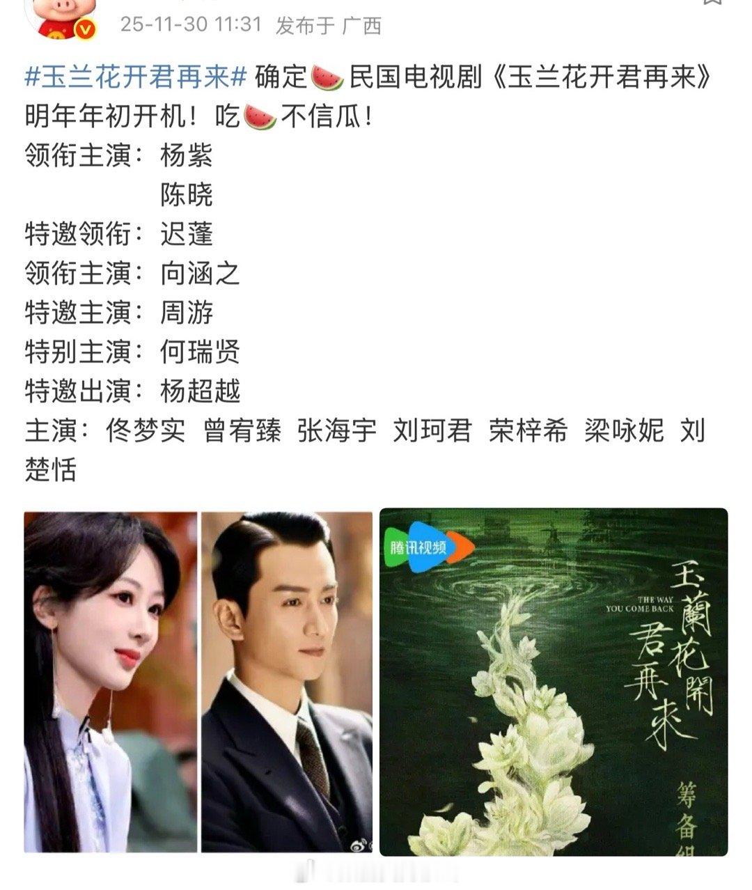 刚刷到杨紫的消息——人家休息才不到一个月,又要进新组了!新剧叫《玉兰花开君再