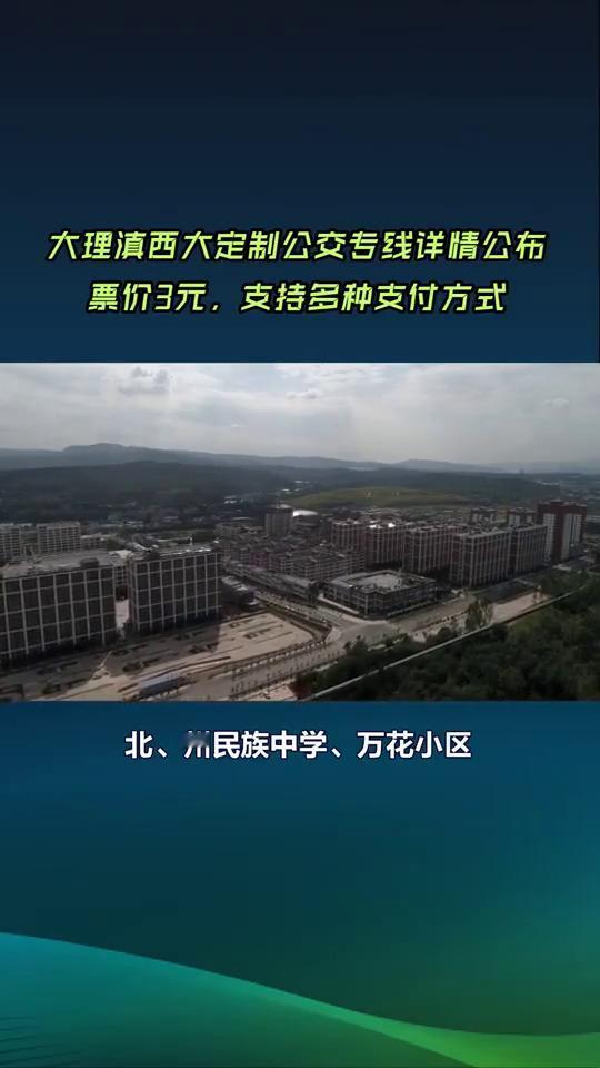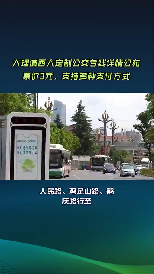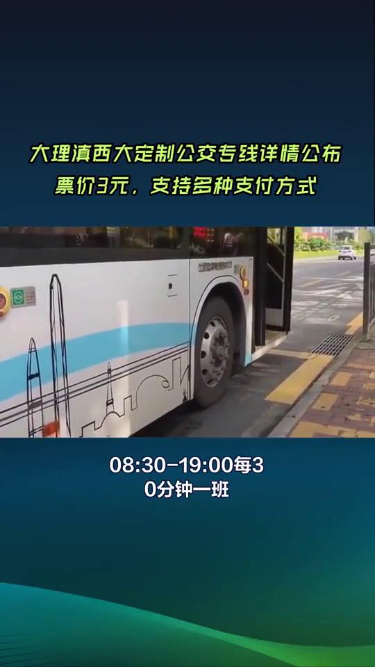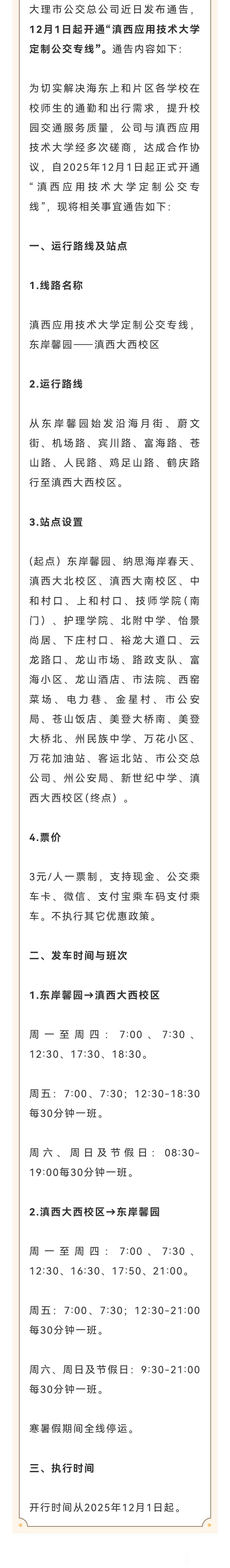 大理滇西大定制公交专线详情公布,票价3元,支持多种支付方式。 🚌大理这条定制公交专线即将开通。大理市公交总公司近日发布通告,12月1日起开通滇西应用技术大学定制公交专线。通告内容如下:为切实解决海东上和片区各学校在校师生的通勤和出行需求,提升校园交通服务质量,公司与滇西应用技术大学经多次磋商达成合作协议,自2025年12月1日起正式开通滇西应用技术大学定制公交专线。 现将相关事宜通告如下: ·一、运行路线及站点: →1、线路名称:滇西应用技术大学定制公交专线:东岸馨园--滇西大西校区。 →2、运行路线:从东岸馨园始发沿海月街、蔚文街、机场路、宾川路、富海路、苍山路、人民路、鸡足山路、鹤庆路行至滇西大西校区。 →3、站点设置:东岸馨园、纳思海岸春天、滇西大北校区、滇西大南校区、中和村口、上和村口、技师学院、护理学院、北附中学、怡景尚居、下庄村口、裕龙大道口、云龙路口、龙山市场、路政支队、富海小区、龙山酒店、市法院、西窑菜场、电力巷、金星村、市公安局、苍山饭店、美登大桥南、美登大桥北、州民族中学、万花小区、万花加油站、客运北站、市公交总公司、州公安局、新世纪中学、滇西大西校区。 ·二、票价3元/人一票制,支持现金、公交乘车卡、微信、支付宝乘车码支付乘车,不执行其它优惠政策。 ·三、发车时间与班次: →1、东岸馨园→滇西大西校区:周一至周四7:00、7:30、12:30、17:30、18:30。周五:7:00、7:30、12:30-18:30每30分钟一班。周六、周日及节假日08:30-19:00每30分钟一班。 →2、滇西大西校区→东岸馨园:周一至周四7:00、7:30、12:30-16:30、17:50、21:00。周五:7:00、7:30、12:30-21:00每30分钟一班。周六、周日及节假日9:30-21:00每30分钟一班。寒暑假期间全线停运。 ·四、执行时间开行时间:从2025年12月1日起。 公交