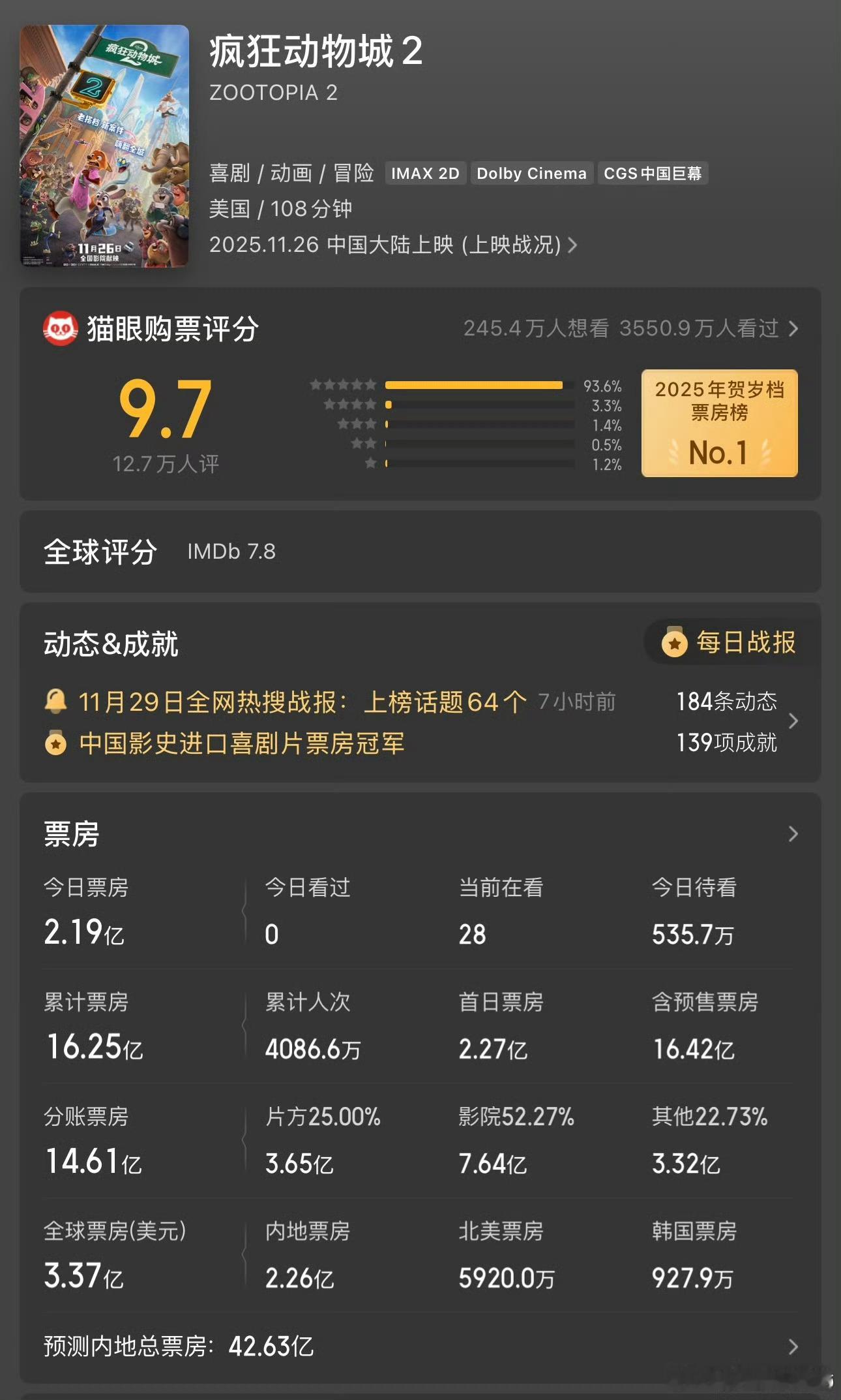 疯狂动物城2票房最新消息~疯狂动物城2预测票房来到了42亿多,实时票房已经破16亿了,太猛了!哈哈哈哈