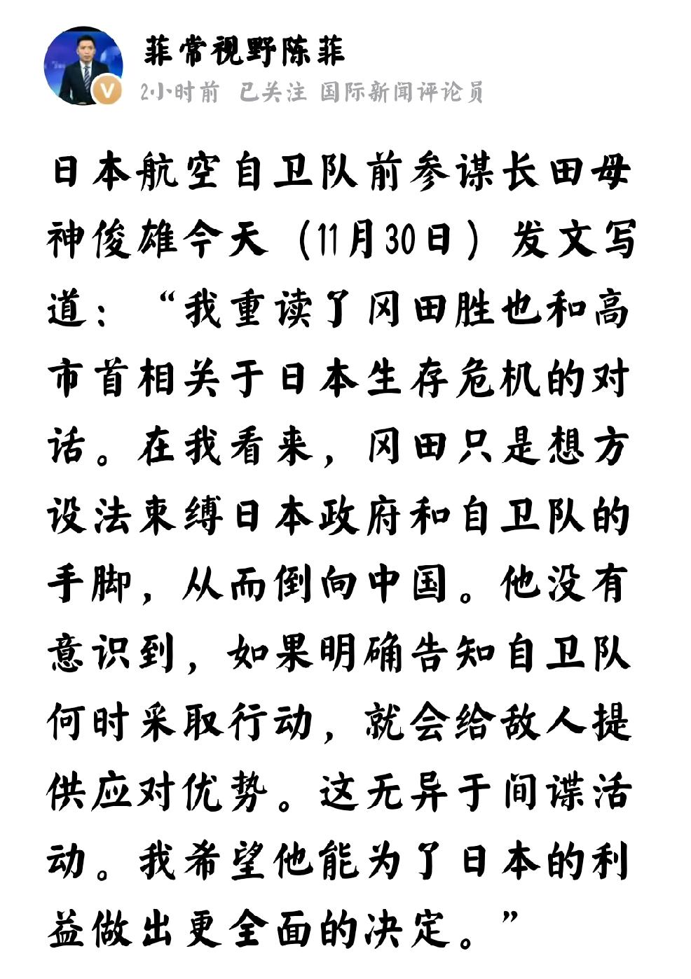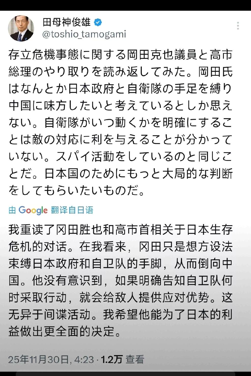 日本当前领导层的支持者 个人观点:这就是当前日本领导层的支持者,所发布的支持高市早苗的言论,发布者是日本自卫队前高官总参谋长田姆神俊雄 11月30日发布。 简直是一派胡言,恶意构陷,颠倒黑白,倒打一耙,指鹿为马。 此外,个人从网上搜集关于日本自卫队的基本情况,可以略微了解一下,轻易的就得出:“现在的日本,不堪一击的结论”。 如果我们依照联合国宪章,依照条约,完全可以先发制人,就能达到超越“李梅烧烤,西伯利亚挖土豆”这两个丰功伟绩。 可以说,现在是无限接近封狼居胥的时刻。这是近现代中国军人,即中国武将,所能达到的武勋最高水平。 如果达到反制日本,那么史书上一定会把反制日本和中国历史上的最高武勋,冠军侯-霍去病— 封狼居胥,并驾齐驱,这是何等的荣耀,将会被历朝历代,世世代代的中国人所敬仰。