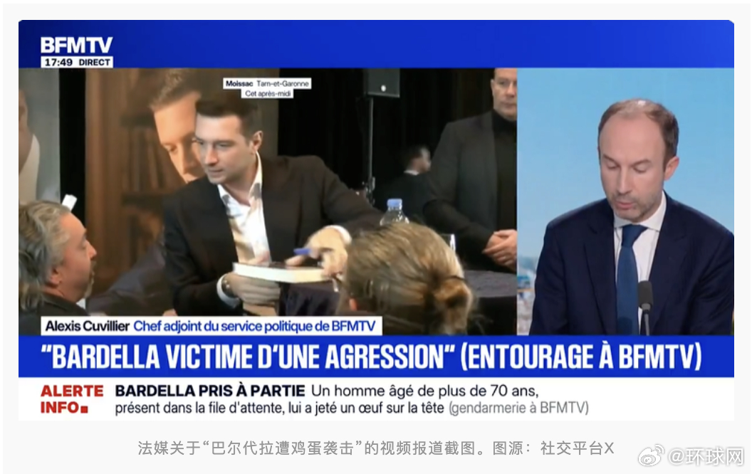#法极右翼政党主席被鸡蛋砸头#【法媒:遭泼洒面粉袭击后,法国极右翼政党主席又遭鸡蛋袭击】#法国政客被鸡蛋砸头#据法新社报道,法国极右翼国民联盟主席巴尔代拉当地时间29日遭到鸡蛋袭击,涉事嫌疑人已被捕。同日晚些时候,巴尔代拉在社交平台X上称自己状况良好。报道称,巴尔代拉当天在法国西南部穆瓦萨克参加活动宣传其新书时,一个男子把鸡蛋砸在了他的头上。事后,当地检察官布鲁诺表示,嫌疑人年龄为74岁,因对公职人员实施暴力而被拘捕。巴尔代拉方面已就此提起诉讼。同日晚些时候,巴尔代拉在X平台上发文报平安并感谢支持。他还指责了“来自极左翼的暴力、偏执和愚蠢”。报道提到,这已是本周内巴尔代拉遭到的第二起袭击。周二(25日),巴尔代拉在法国东部沃苏勒参加一场农业展览会时,曾被人泼洒面粉。为此,警方拘捕了一名17岁少年,但第二天将其释放。该少年被要求参加公民课程。