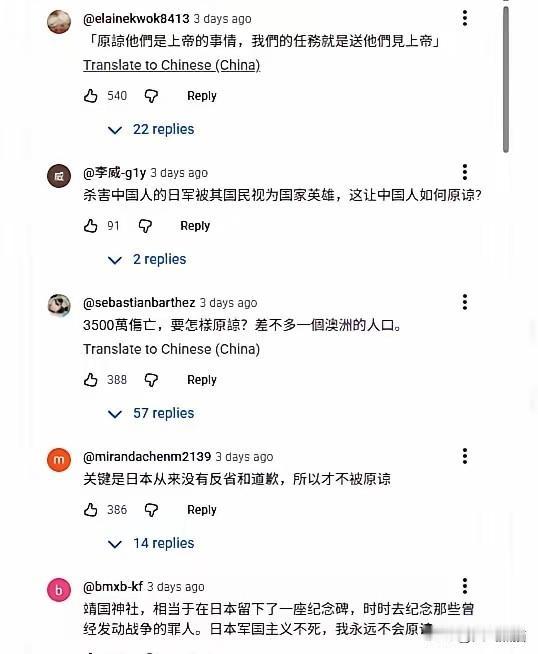 这才是中国年轻人该有的样子。 在外网上,这些年轻人对日本的观点,获得了大量点赞。 日本竟然把对于屠害3500万中国同胞的战犯当成英雄,还让我们放下历史,祈求我们原谅,没有人能做的到,澳大利亚至今都没有3000万,这个人口相当于现在英法德任何一个国家人口的一半,谁能承受得了如此大的损失,谁又能提前辈原谅这么滔天的罪行。 日本把这些战犯供奉起来,就应该接受这罪行所带来的反噬。