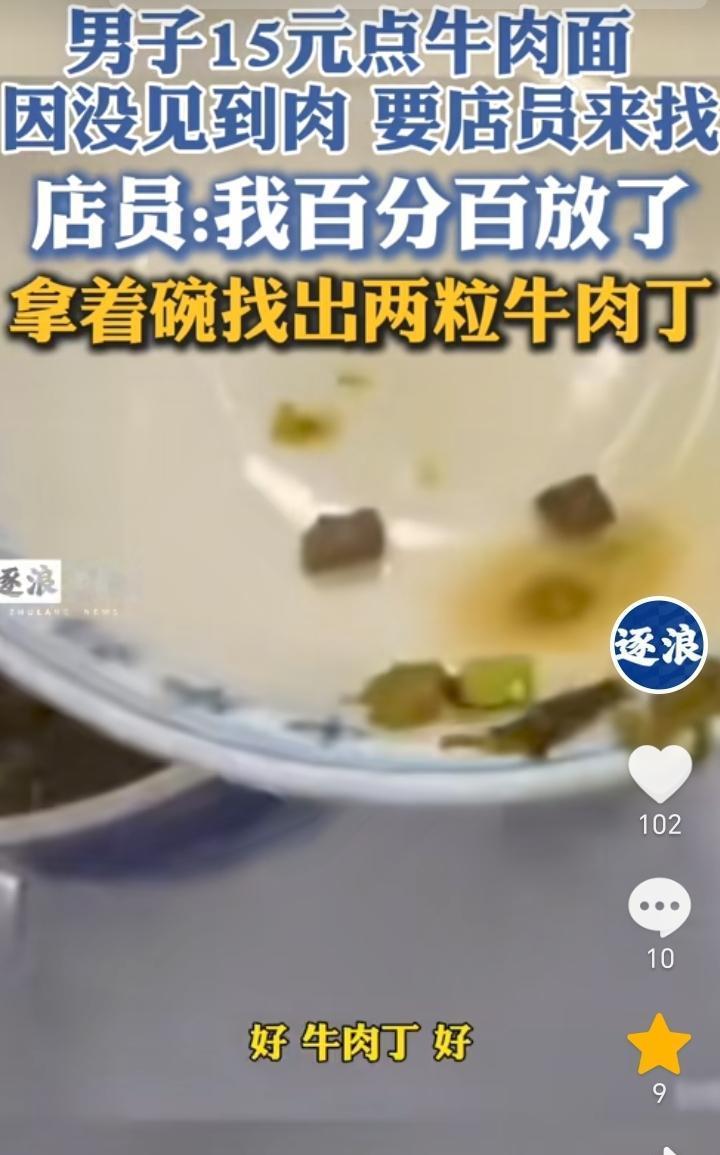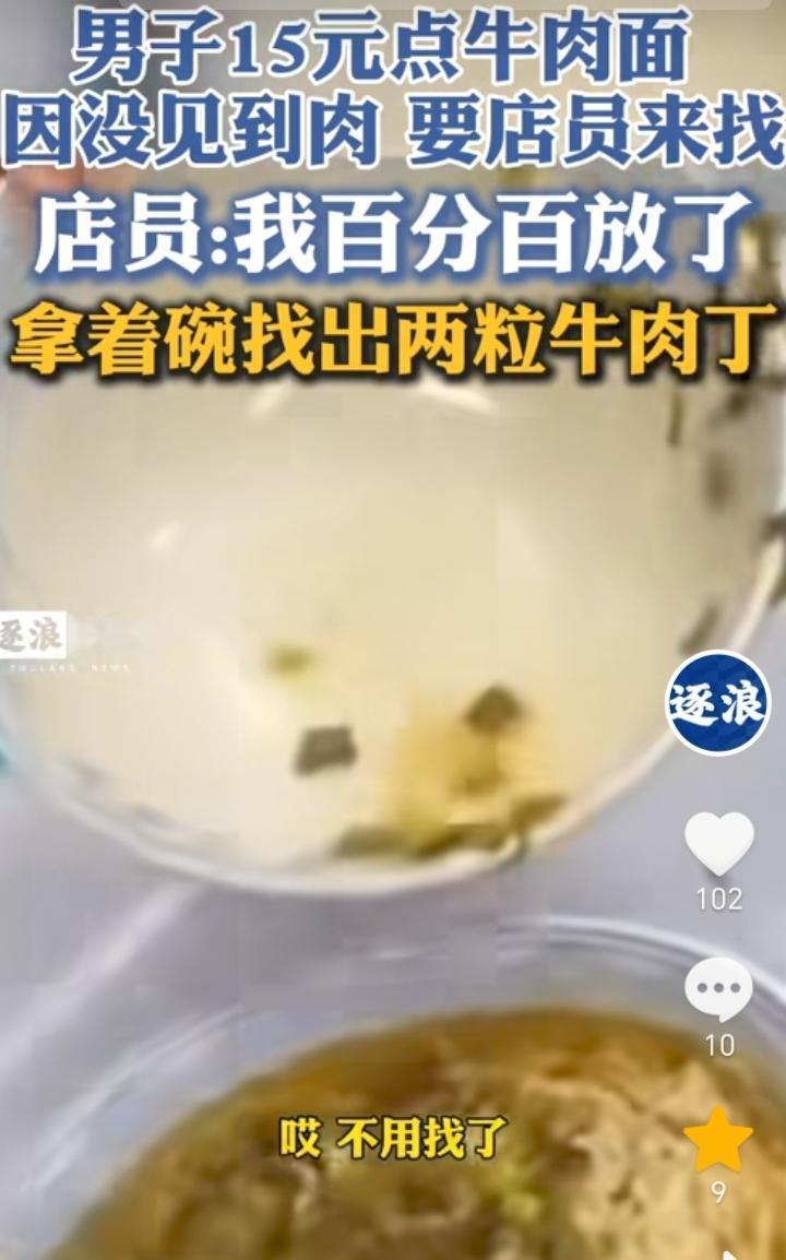 奸商!新疆,男子去面馆吃饭,点了一份15元的牛肉面,结果面端上来男子发现牛肉面里面没见牛肉,对此店员表示百分之百放了,最后拿着碗找出来了两粒牛肉丁,男子也是没有吃直接付完款就走了。 真是一个奸商,说的是牛肉面,卖的也是牛肉面的价格,实际上里面就两粒牛肉丁,就连方便面调料包里面都有好几粒牛肉丁,价格也没有这么贵。 男子直接付钱走了,以后肯定也是不会再去这家面馆了,面馆这样做生意倒闭可能也是迟早的事。 做生意要有格局,主要还是要留住客人,不能只做一锤子买卖。