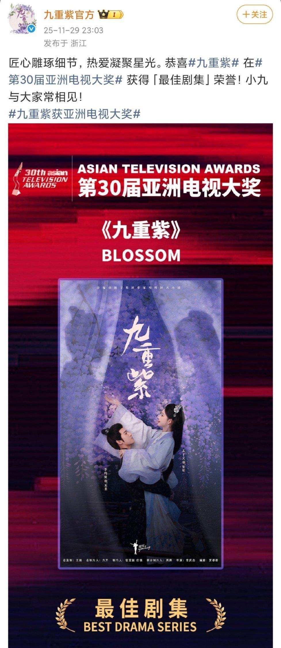孟子义 李昀锐《九重紫》获得第30届亚洲电视大奖最佳剧集,我嘞个超绝长尾九重紫亚洲电视大奖最佳剧集