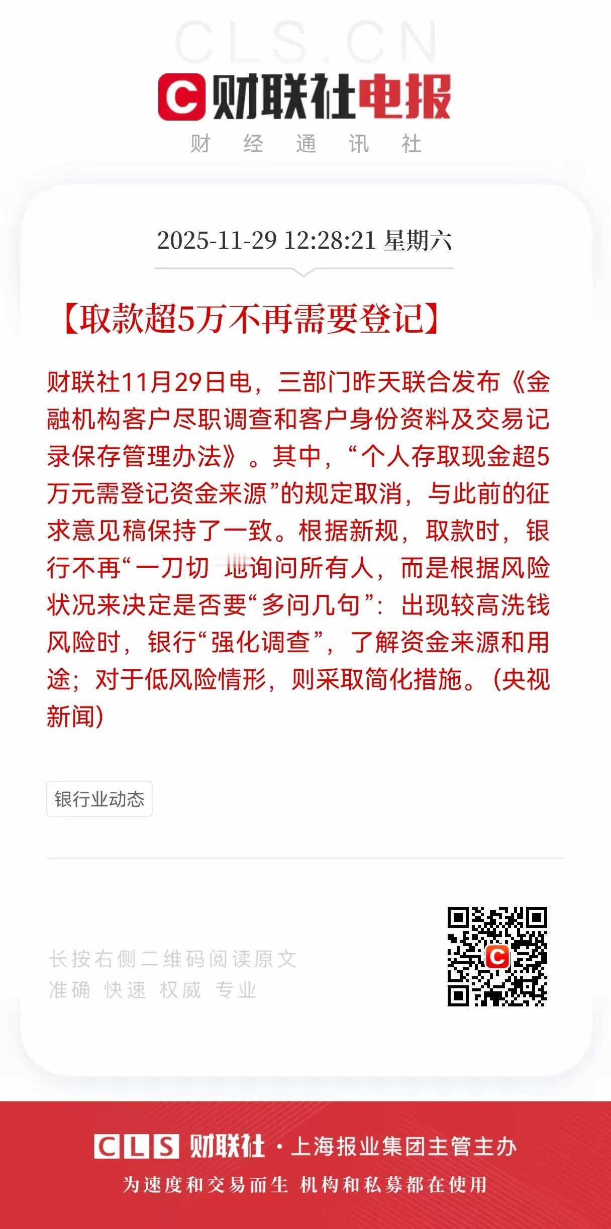 这个是利国利民利好的政策,减少了老百姓的不方便。取款超过5万,不需要再登记!这样省的很多老人取款,被问来问去!其实之前为了取款,类似的事情给老百姓也带来很多不便的麻烦!就算是你要防止洗黑钱,但地方政府有的也不能一刀切