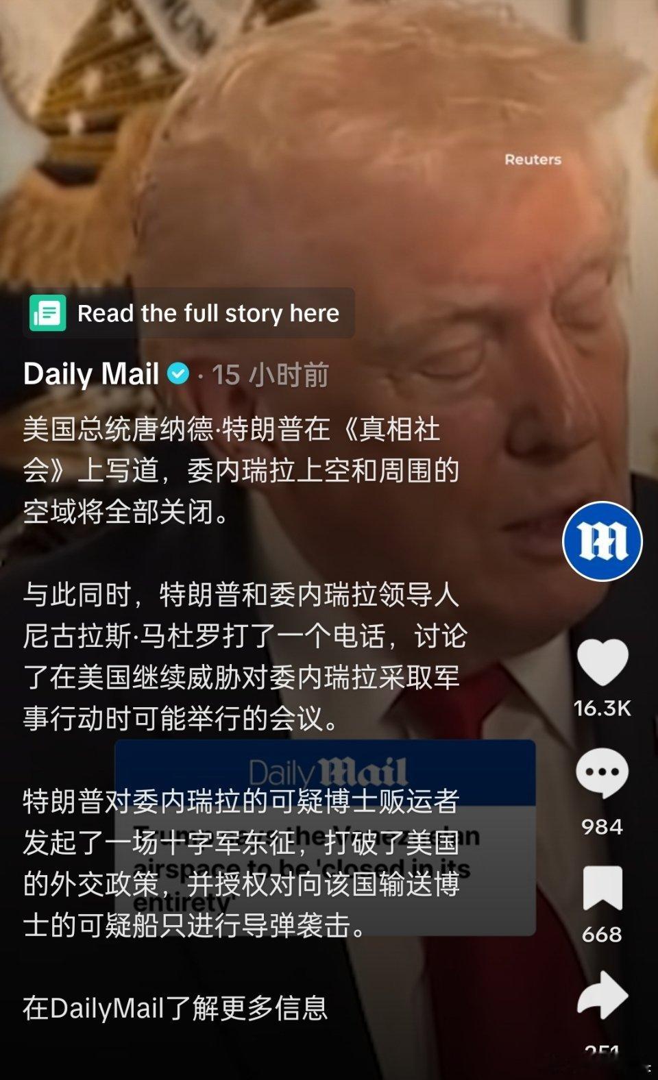 美国 委内瑞拉美国这是在对委内瑞拉步步紧逼啊。美国总统唐纳德特朗普在《真相社会》上写道,委内瑞拉上空和周围的空域将全部关闭。美洲局势海外新鲜事
