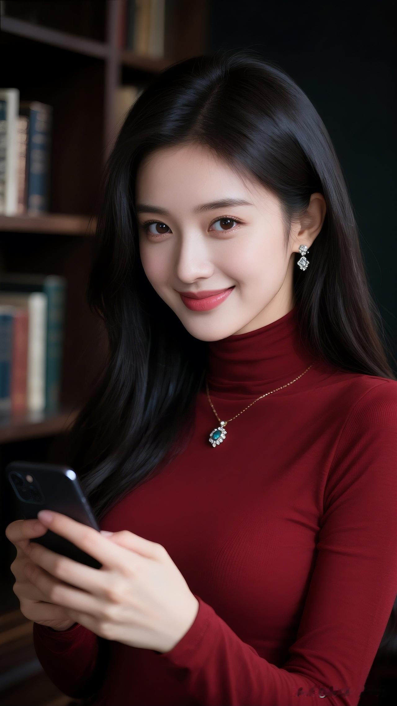 书香满溢,美女如画。浪漫随性日常穿搭 优雅红衣少女,书香气息满满,手机轻握,微笑迷人