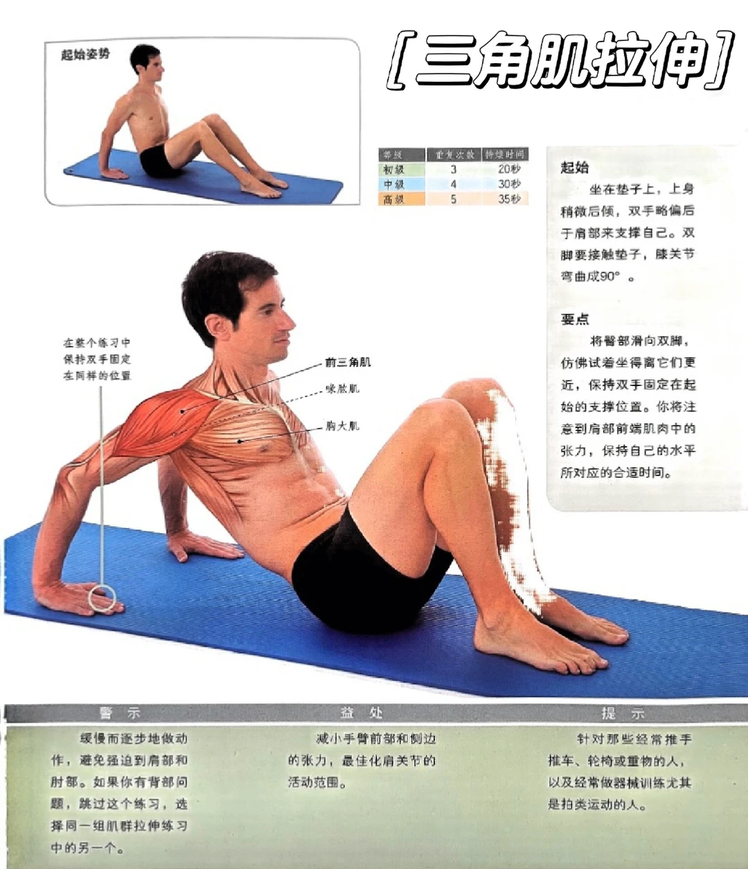 是否感觉自己的肩膀经常酸痛无力,导致自己的健身计划全部泡汤。可能是我们训练强度较大,肩部力量跟不上所导致的。三角肌,是肩膀所有运动的原动肌。所以,想要肩部力量变强,我们就要进行一个三角肌的训练。我们在经过三角肌训练后,为了取得更好的锻炼效果,会在结束动作的时候,给处于紧张的肩部肌肉进行放松,更好地促进肌肉的生长。一个充分的拉伸,会让我们锻炼效果更加突出! 摘自拉伸训练