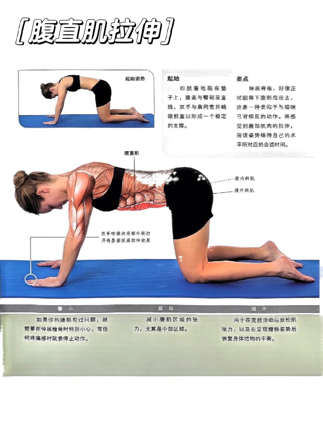 腹部拉伸1️⃣ 📣提示: 1配合呯吸 2.对称拉伸 2.不要过度拉伸 (15~30秒1组)1~3组 ⬇️总结: 也有人想通过锻炼腹肌让小肚腩消失。练腹肌之前可以先做些拉伸,增强腹肌的柔韧度。腹肌紧张僵硬,会造成骨盆后倾,肋骨位置下降。腹肌柔韧度好,骨盆自然回归中立位,挺胸的姿势就容易保持。 摘自拉伸训练 喜欢收藏➕关注[红色心形R]