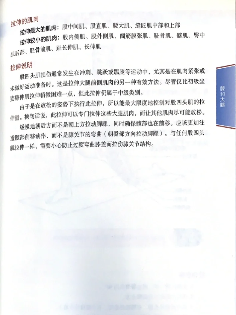 由于是在放松的姿势下执行此拉伸,所以能最大限度地控制对股四头肌的拉伸量。换句话说,此拉伸可以专门拉伸这些大腿肌肉,而让其他肌肉尽可能放松。