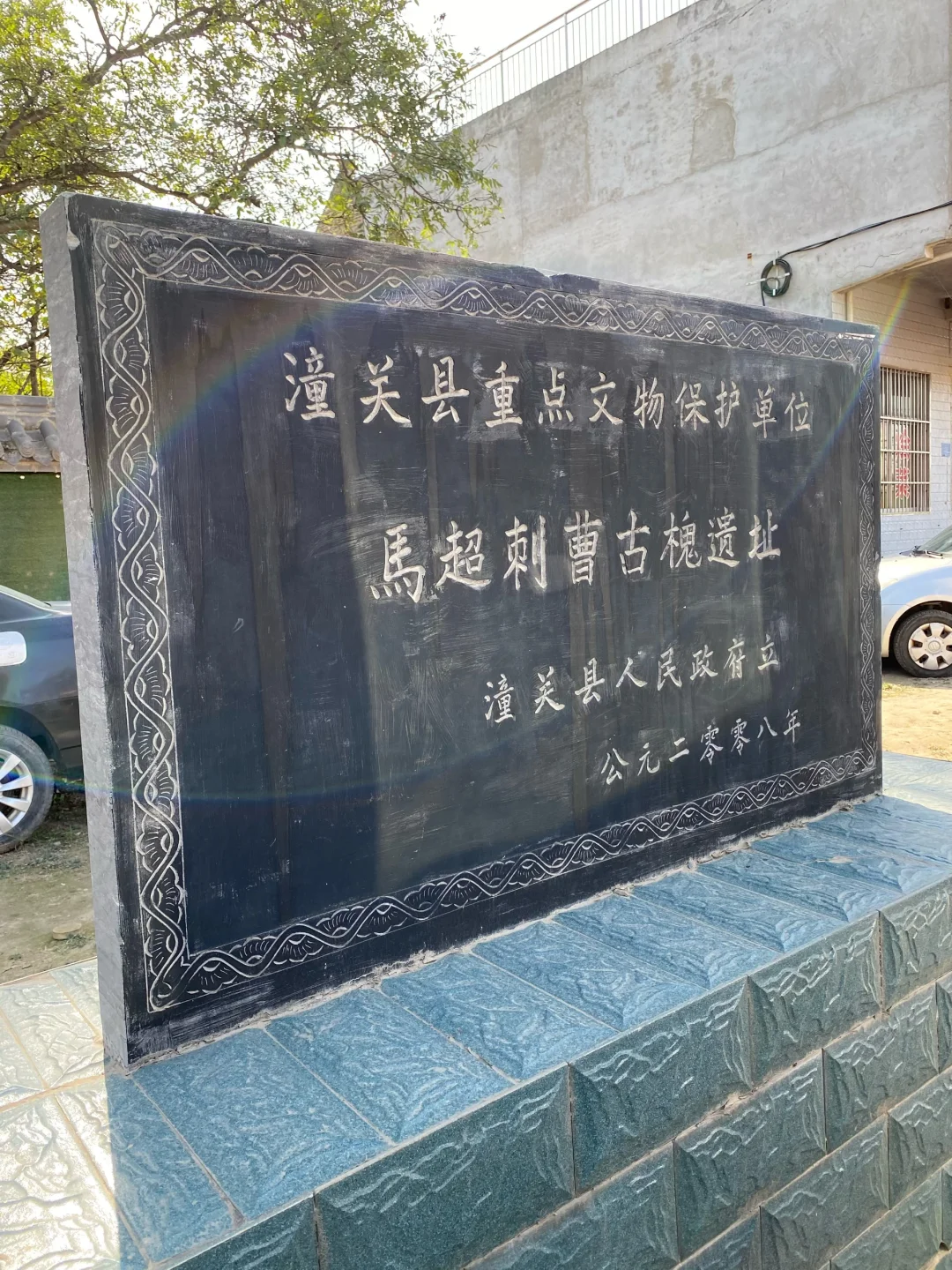• 古槐现状:原古槐主杆高约5米,直径2米有余,树身有一深沟,传为马超所刺枪眼。20世纪50年代,古槐遭雷击,后因潼关老县城搬迁,枯树被移至县文化馆陈列。后来,在原古槐树根上蘖生了一棵新槐,长势良好。2000年2月15日,潼关县人民政府公布马超刺曹古槐遗址为县级重点文物保护单位,保护主体为蘖生槐树,保护范围为保护主体外延20米。