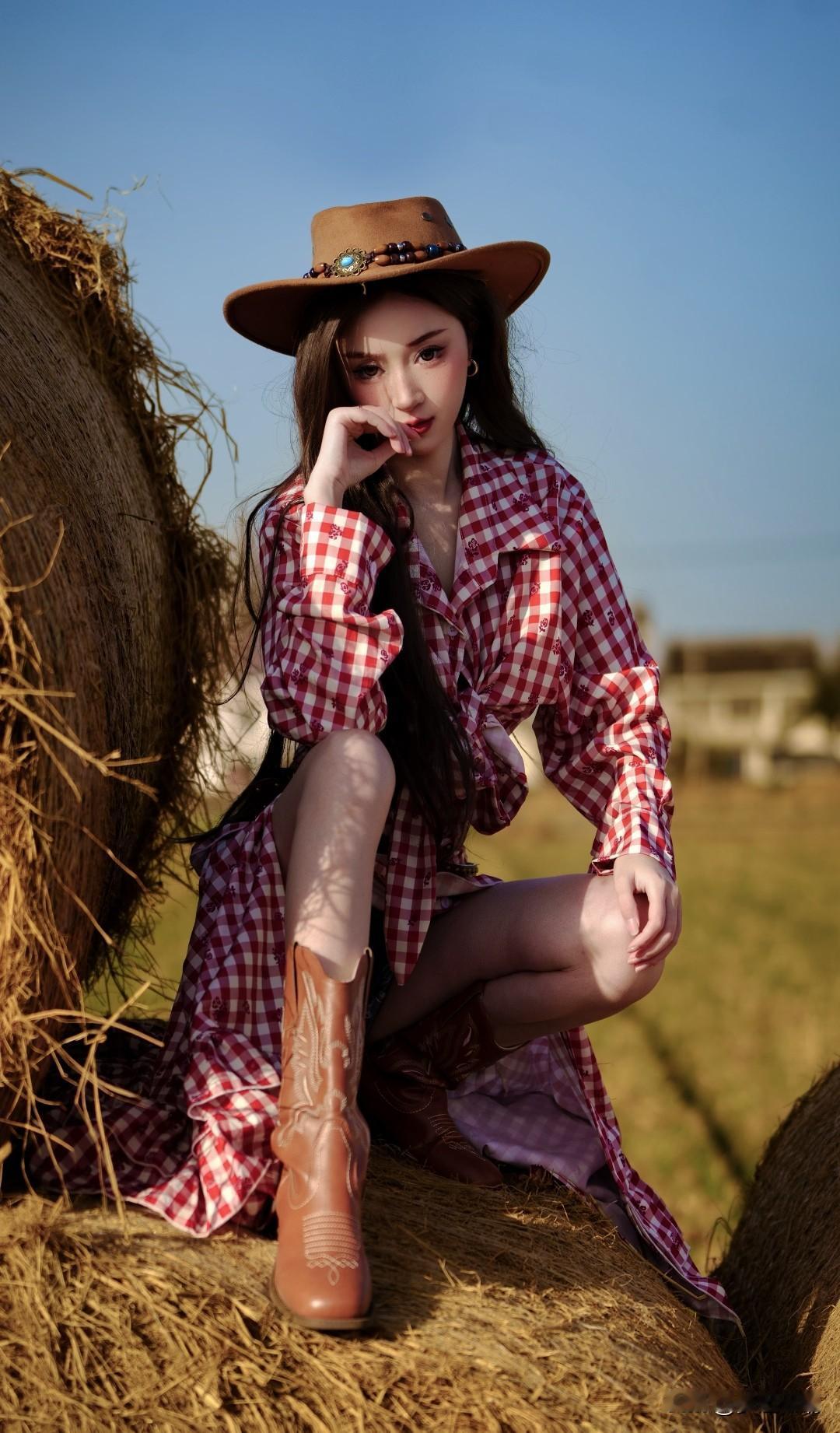 田园少女风,红格子衬衫,牛仔靴,坐在干草堆上,阳光明媚。