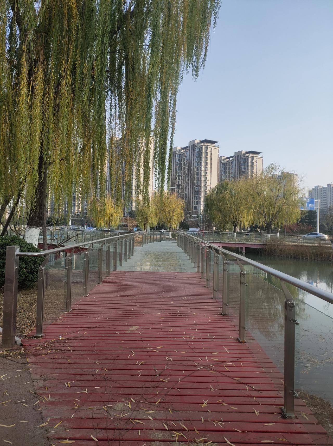 冬日午后暖阳,漫步河畔小径,红桥绿柳,湖水碧波荡漾,城市公园的宁静时光。🌞🍂