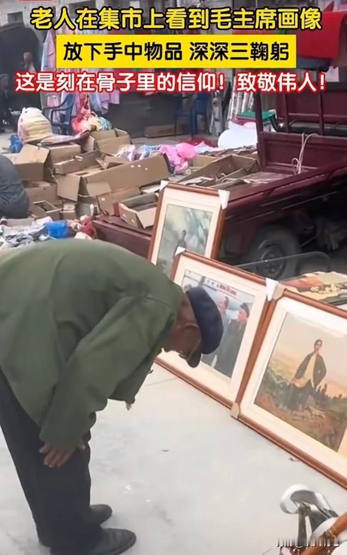 甘肃定西,一衣衫褴褛老人看到街边的一幅画,微微一愣,没想到,他直接朝画像深深的鞠躬三下,把旁边的路人都惊呆了,原来,他看到是一张毛主席的画像。 视频中,这是一个街边卖字画的摊位,只见老板在旁边忙碌着,而当他看到缓缓走来,并没有在意,只顾自顾自的在自己整理。 当老人走到摊位前,神情严肃,他把身上的东西一件一件的放在地上,走到画像前面,对着画像深深的鞠了三个躬。 原来,老人看到画像不是一般画像,而是一张毛主席的画像,也许只有老一辈的人才懂得,毛主席在人民心目中的地位有多重要吧。 这一幕传到网上,网友们被深深触动到了,这大概就是刻到骨子里的信仰吧。 一个连走路都有点吃力的老人,看到毛主席的画像,没有顾忌周围人,就是深深的三个鞠躬。 老人也许穷,但他心里装着比钱更珍贵的东西,那是经历过苦日子的人,对带他们过上好日子的那个人的感恩;那是亲眼见过旧社会和新社会的人,才懂的那份情。 年轻人也许不太理解,但看着老人放下东西、郑重鞠躬的样子,谁都能感受到那份真诚。因为真正的信仰,就是这样朴素、这样坚定。 所以,这街边普通的一幕,因这位老人而让人动容。 他鞠的不只是一幅画,更是他这辈子忘不掉的恩情。 世道变了,日子好了,但有些东西不该忘。愿我们在忙着往前走的时候,也记得那些让我们站起来的人;愿每个老人心中的信仰,都能被这个时代温柔以待。