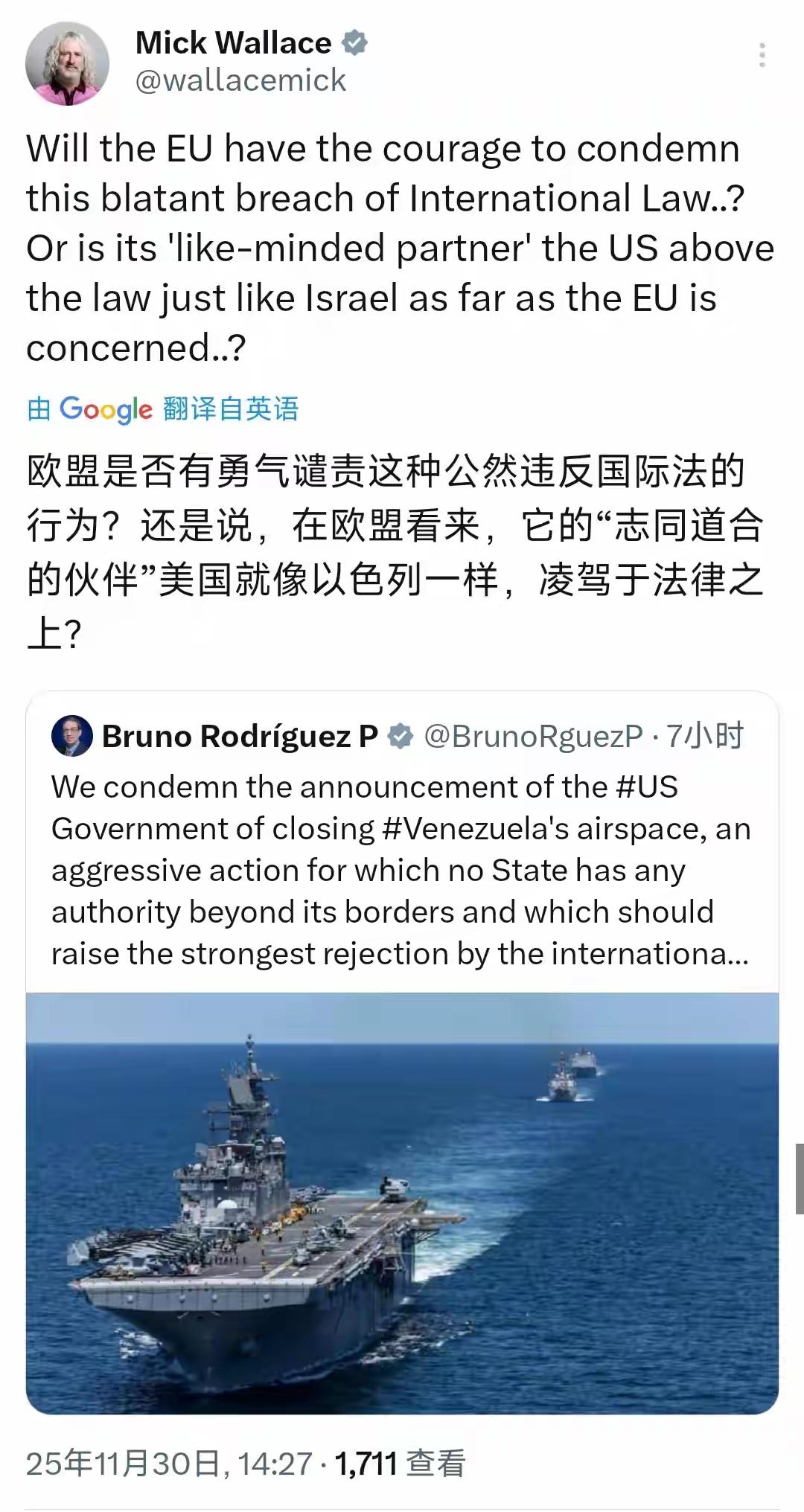 美国是真霸道!竟然直接违反国际法宣布关闭委内瑞拉领空,看看现在的委内瑞拉领空,飞机都躲着飞。面对如此霸道行为,古巴强烈谴责。而欧盟默不作声的选择性失明,让欧洲议会议员米克·华莱士看不下去了。华莱士转发古巴外交部长布鲁诺·罗德里格斯·帕里利亚的发文,批评欧盟的默不作声,他发文写道:“欧盟是否有勇气谴责这种公然违反国际法的行为?还是说,在欧盟看来,它的‘志同道合的伙伴’美国就像以色列一样,凌驾于法律之上?” 欧盟敢谴责吗?