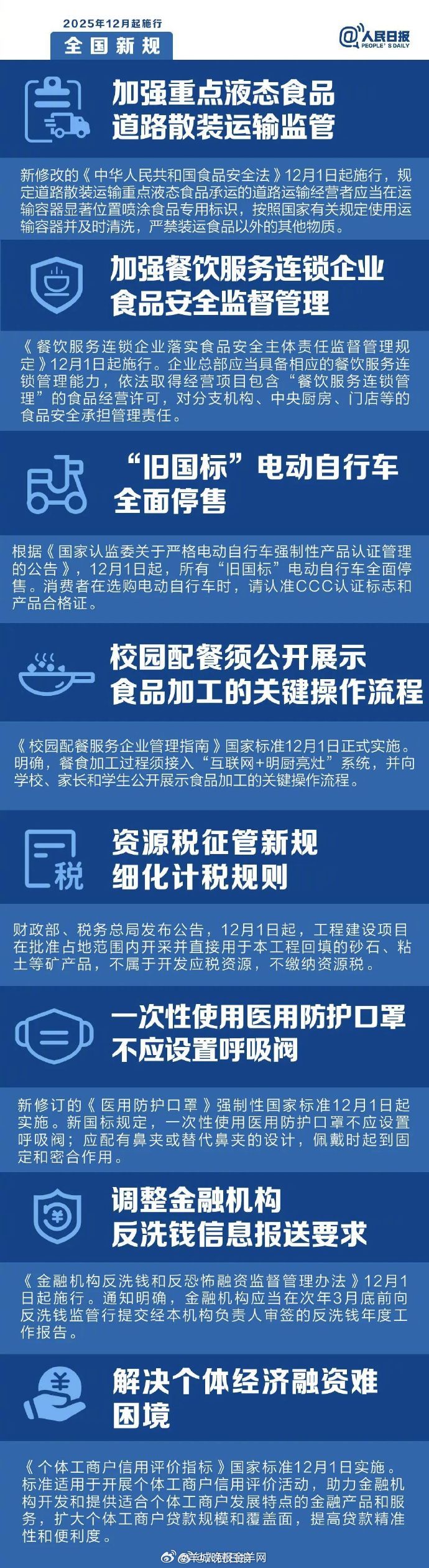 【#12月起这些新规开始施行#】①加强餐饮服务连锁企业食品安全监督管理;②#12月起旧国标电动自行车全面停售#;③一次性使用医用防护口罩不应设置呼吸阀;④北京:禁止使用高排放非道路移动机械;⑤辽宁:推动职业教育高质量发展……更多,戳图了解↓↓↓