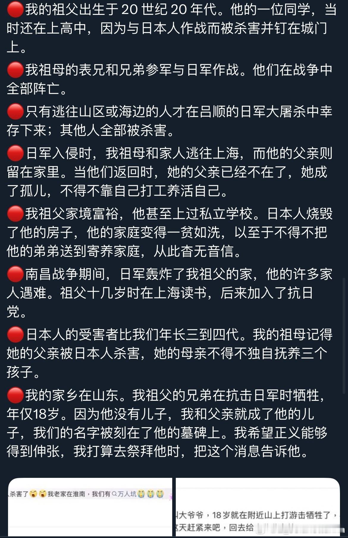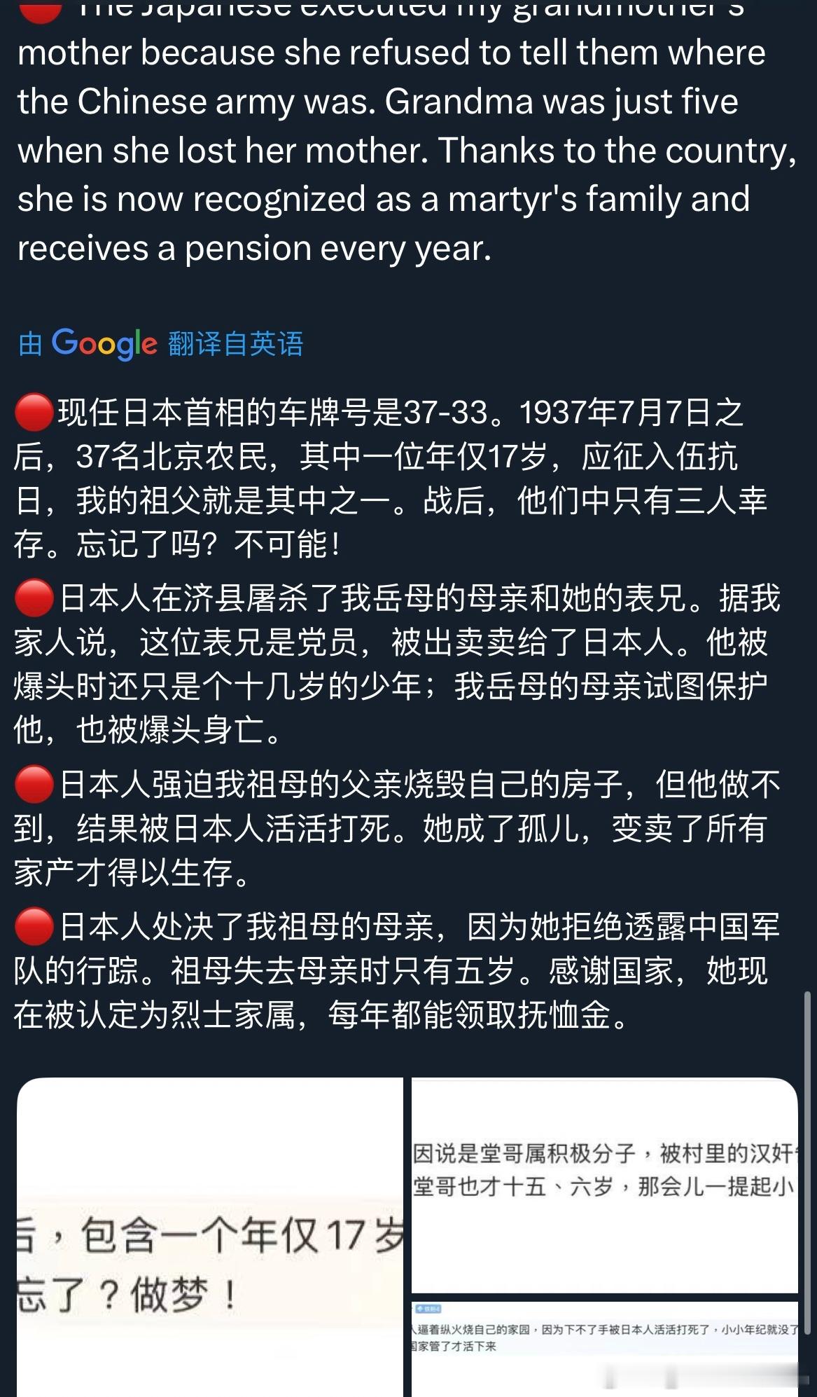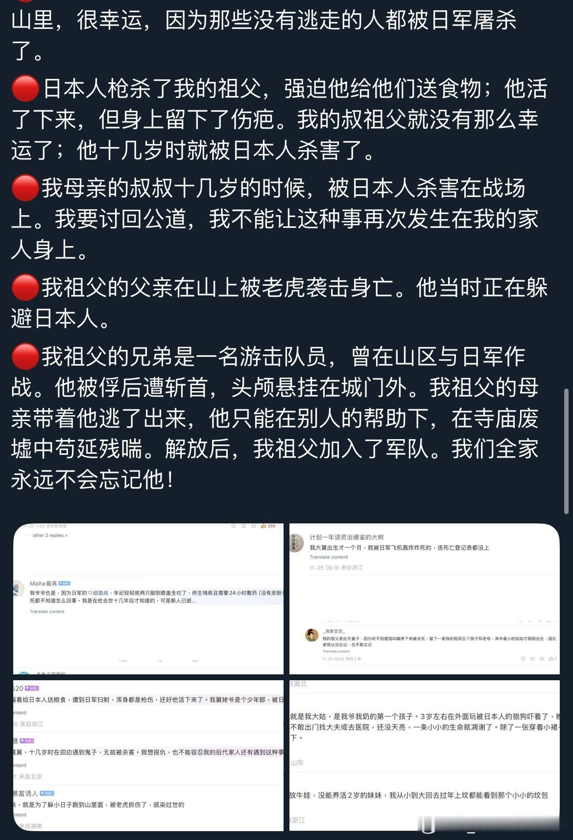 中国人民不答应中国军队不答应我常常在想,在日本右翼政客试图篡改历史、日本军国主义意图死灰复燃的今天,我们这些普通中国人能做些什么?前段时间,收到了许多来自全国各地的网友留言。他们分享了各自家族在抗日战争中所经历的苦难与折磨。每一个血淋淋的故事背后,都是一个家庭的悲剧与创伤。我将这些故事一一编号整理,翻译成英文,发布到了海外平台。在西方生活多年,我发现他们的历史教科书中很少——甚至完全不——提及中国人民为世界反法西斯战争所作出的巨大贡献,对日本侵华罪行几乎一无所知。因此,他们可以轻描淡写地说“原谅”,不假思索地谈“和平”,却完全无法理解中国人心中那份沉痛的记忆。当年的受害者们正逐渐离去,而日本仍在篡改历史、参拜战犯。如果连挨打的人都忘记了,打人的人又怎么会记得?高市早苗之流似乎有一种错觉,认为日本在经济腾飞时期给世界留下了积极的印象,便可以借此机会颠倒黑白,洗刷曾经的战争罪行。可现实是,日本政客一次次挑起事端,反而让越来越多世人看清他们丑陋的过去与如今的狡辩,也让更多人开始正视中国人民曾经承受的苦难与伤痛。多行不义,终将自毙。而我们这些普通人所能做的,就是持续把真实的历史传递出去,让世界听见中国人的伤痛,也听见中国人的主张。感谢每一位愿意揭开家族伤痕、让世界看见真相的同胞。