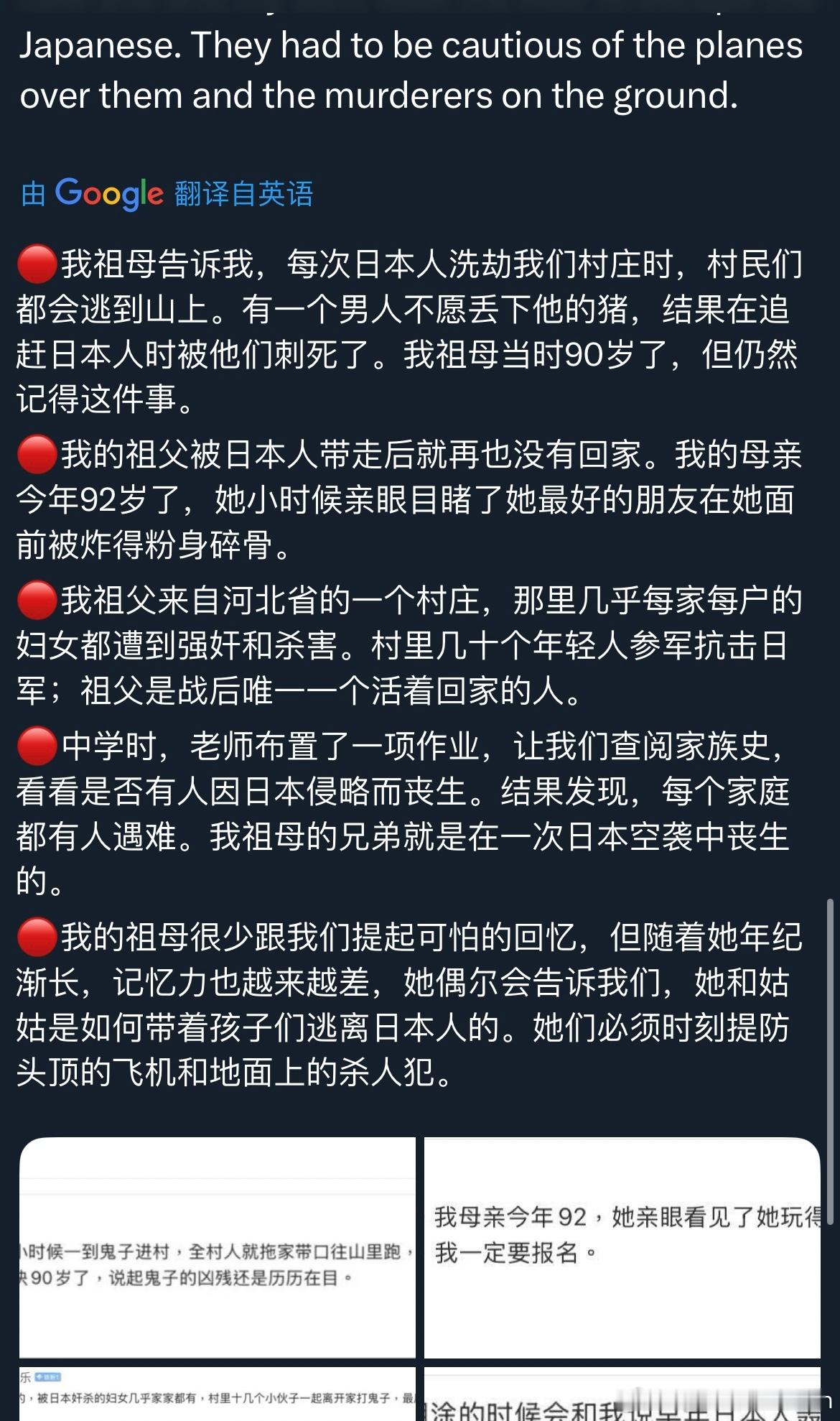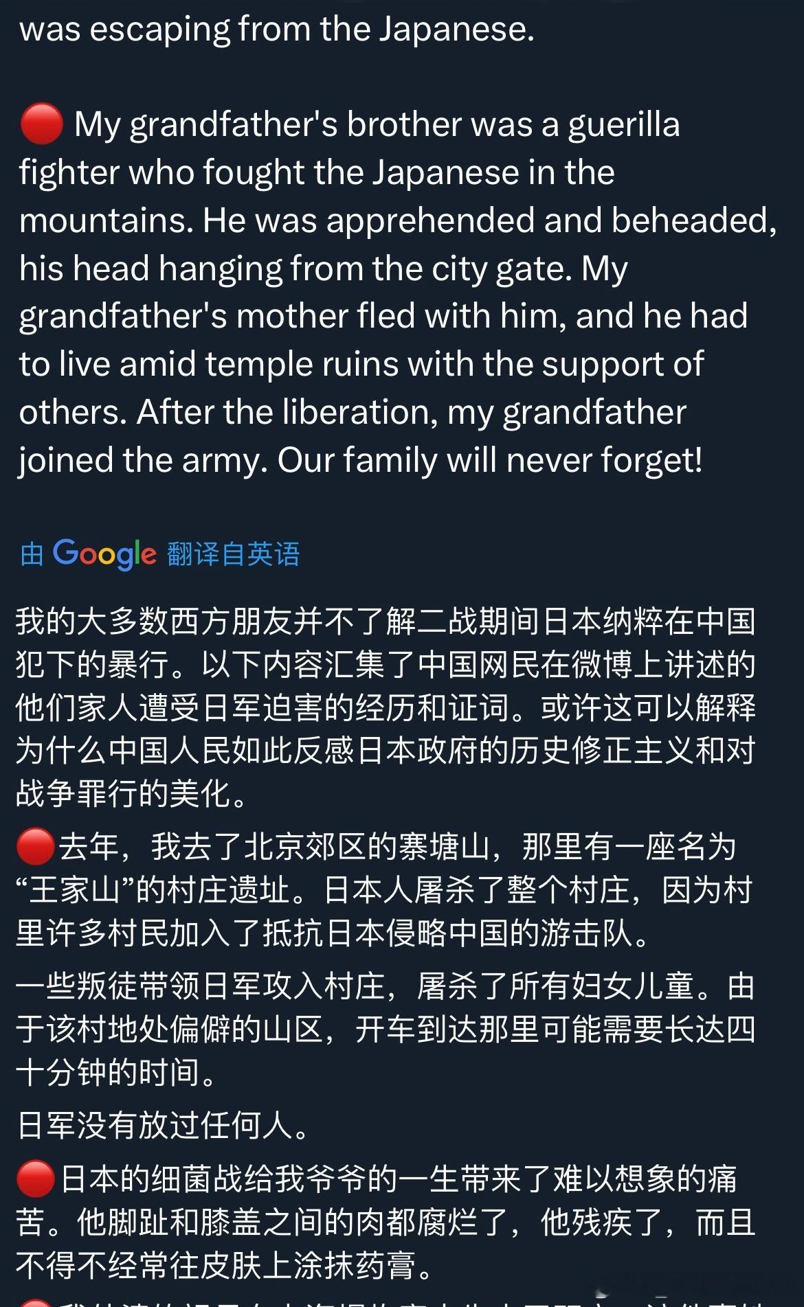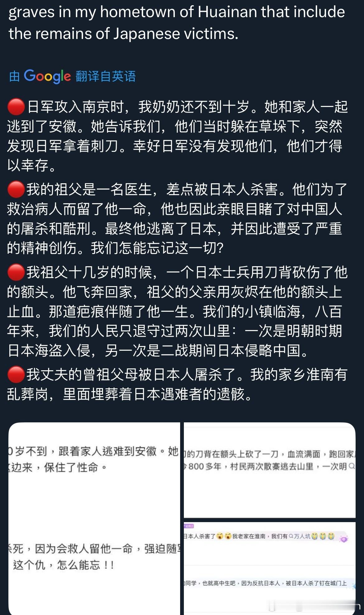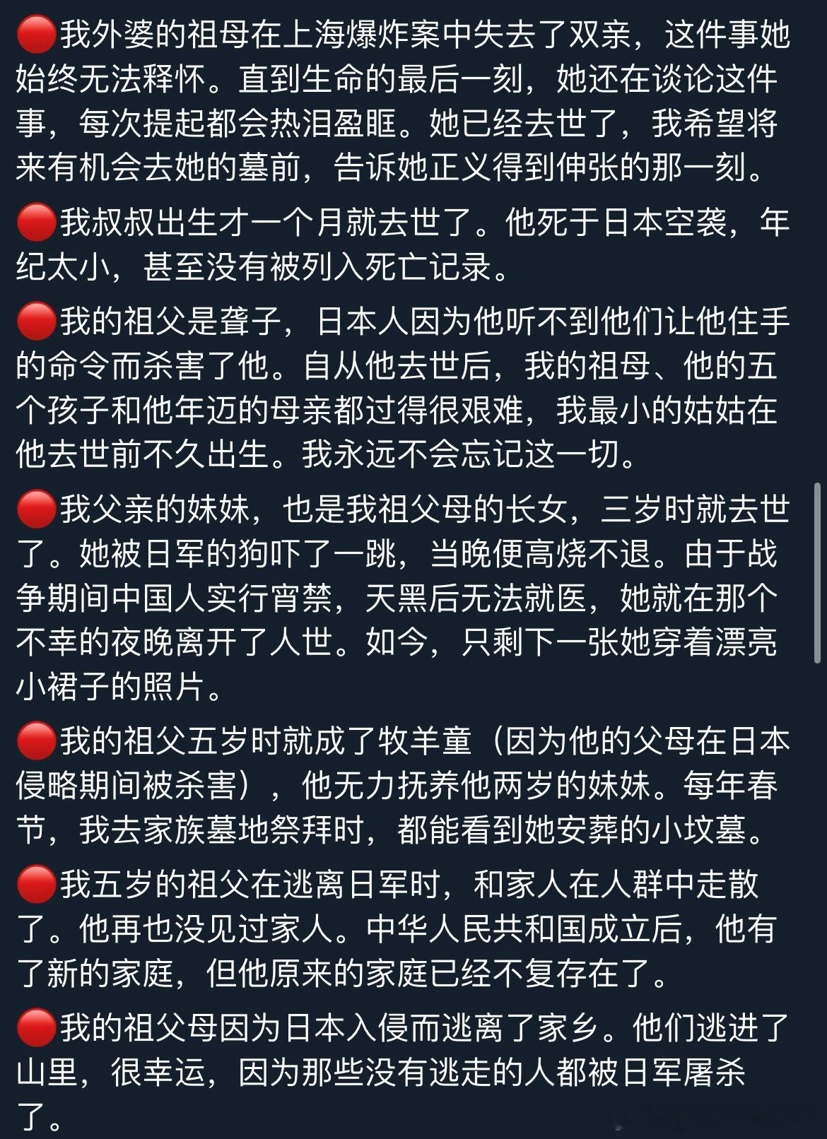 中国人民不答应中国军队不答应我常常在想,在日本右翼政客试图篡改历史、日本军国主义意图死灰复燃的今天,我们这些普通中国人能做些什么?前段时间,收到了许多来自全国各地的网友留言。他们分享了各自家族在抗日战争中所经历的苦难与折磨。每一个血淋淋的故事背后,都是一个家庭的悲剧与创伤。我将这些故事一一编号整理,翻译成英文,发布到了海外平台。在西方生活多年,我发现他们的历史教科书中很少——甚至完全不——提及中国人民为世界反法西斯战争所作出的巨大贡献,对日本侵华罪行几乎一无所知。因此,他们可以轻描淡写地说“原谅”,不假思索地谈“和平”,却完全无法理解中国人心中那份沉痛的记忆。当年的受害者们正逐渐离去,而日本仍在篡改历史、参拜战犯。如果连挨打的人都忘记了,打人的人又怎么会记得?高市早苗之流似乎有一种错觉,认为日本在经济腾飞时期给世界留下了积极的印象,便可以借此机会颠倒黑白,洗刷曾经的战争罪行。可现实是,日本政客一次次挑起事端,反而让越来越多世人看清他们丑陋的过去与如今的狡辩,也让更多人开始正视中国人民曾经承受的苦难与伤痛。多行不义,终将自毙。而我们这些普通人所能做的,就是持续把真实的历史传递出去,让世界听见中国人的伤痛,也听见中国人的主张。感谢每一位愿意揭开家族伤痕、让世界看见真相的同胞。