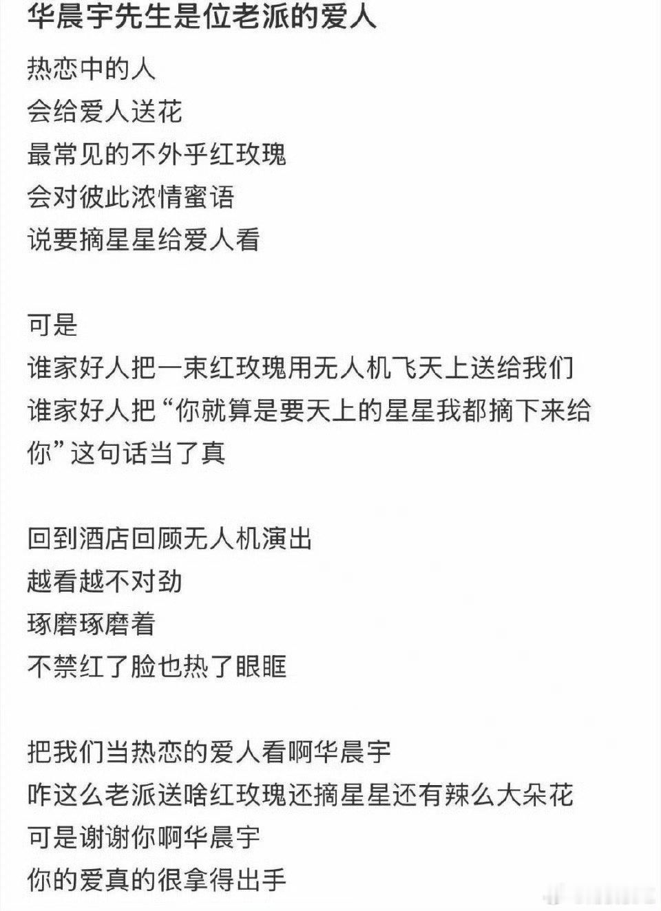 华晨宇老派爱人 他完美复刻了父辈们的浪漫基因——爱要实实在在,情要真真切切。不要虚拟的承诺,只要真实的烟火;不要空洞的情话,只要看得见的星空。