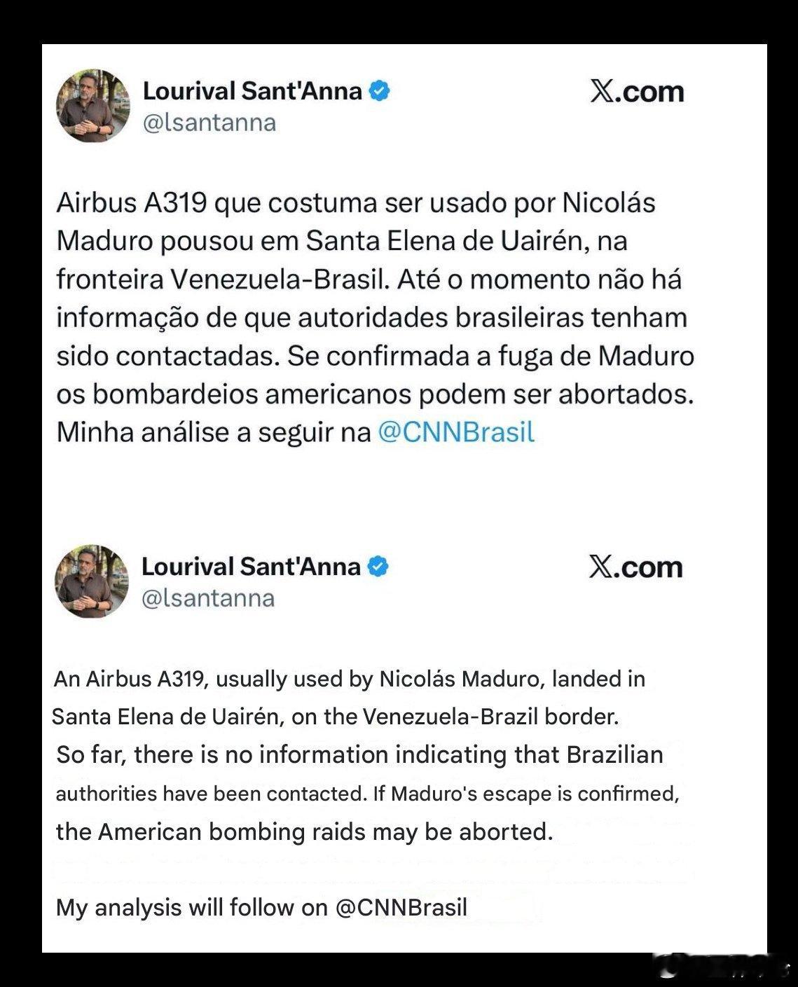 🚨突发消息:🇻🇪🇧🇷 马杜罗的专机降落在巴西边境,这个独裁者可能正在逃亡中🔥那架一直搭载马杜罗的空客A319降落在圣埃莱娜-德乌艾伦 (Santa Elena de Uairén),就在委内瑞拉与巴西的边境线上。 目前还没有官方证实他本人是否在机上,也没证实他是否已向巴西提出庇护,但时间点太巧了,简直就是在喊“我要跑了”!巴西当局表示,目前尚未接到任何联系。 如果马杜罗真的逃了,持续26年的“查韦斯主义”可能一夜之间被彻底终结。 军队将出现分裂:一部分会欢呼庆祝,一部分会做困兽之斗。 反对派 (埃德蒙多·冈萨雷斯、玛丽亚·科里纳) 将立即成为国际社会眼中合法的委内瑞拉政府。 古巴将失去石油生命线,几个月内彻底崩溃;而美国的军事轰炸选项也会被搁置——没必要再去轰炸一个正在自行崩塌的政权了。 这是数百万在马杜罗铁腕统治下,忍饥挨饿的委内瑞拉人祈祷已久的时刻。 如果这只老鼠真的在跑,这表示那这艘大船正在急速沉没。 坚持住,委内瑞拉! 这场噩梦终于快要结束了。 消息来源:CNN Brasil,