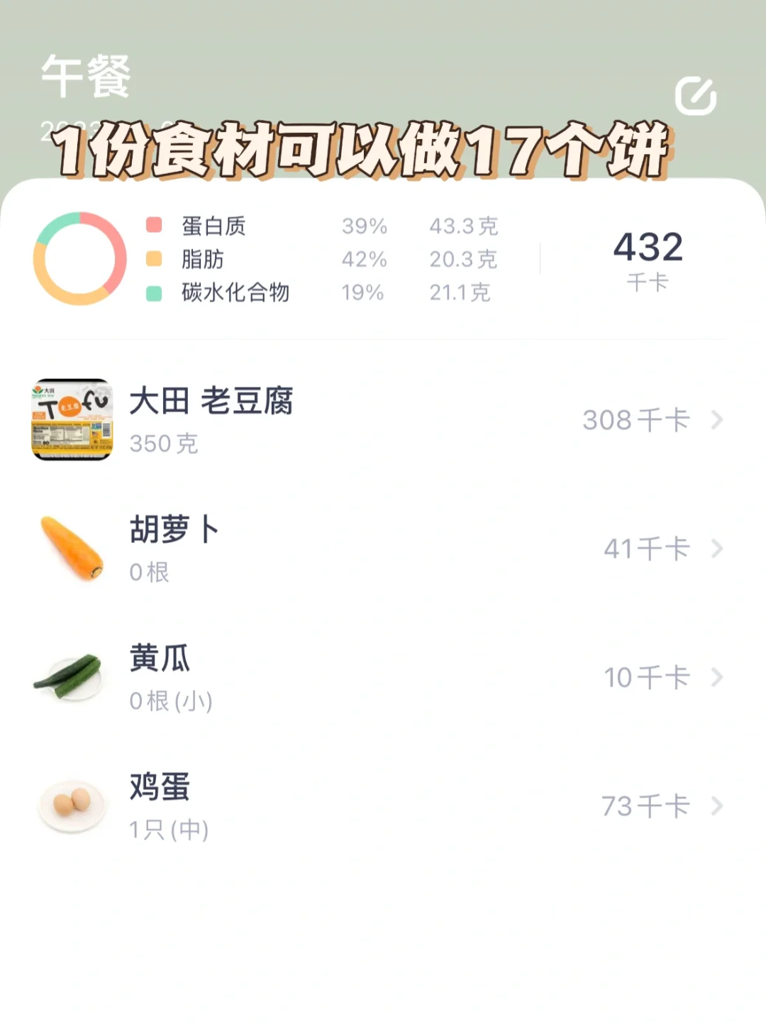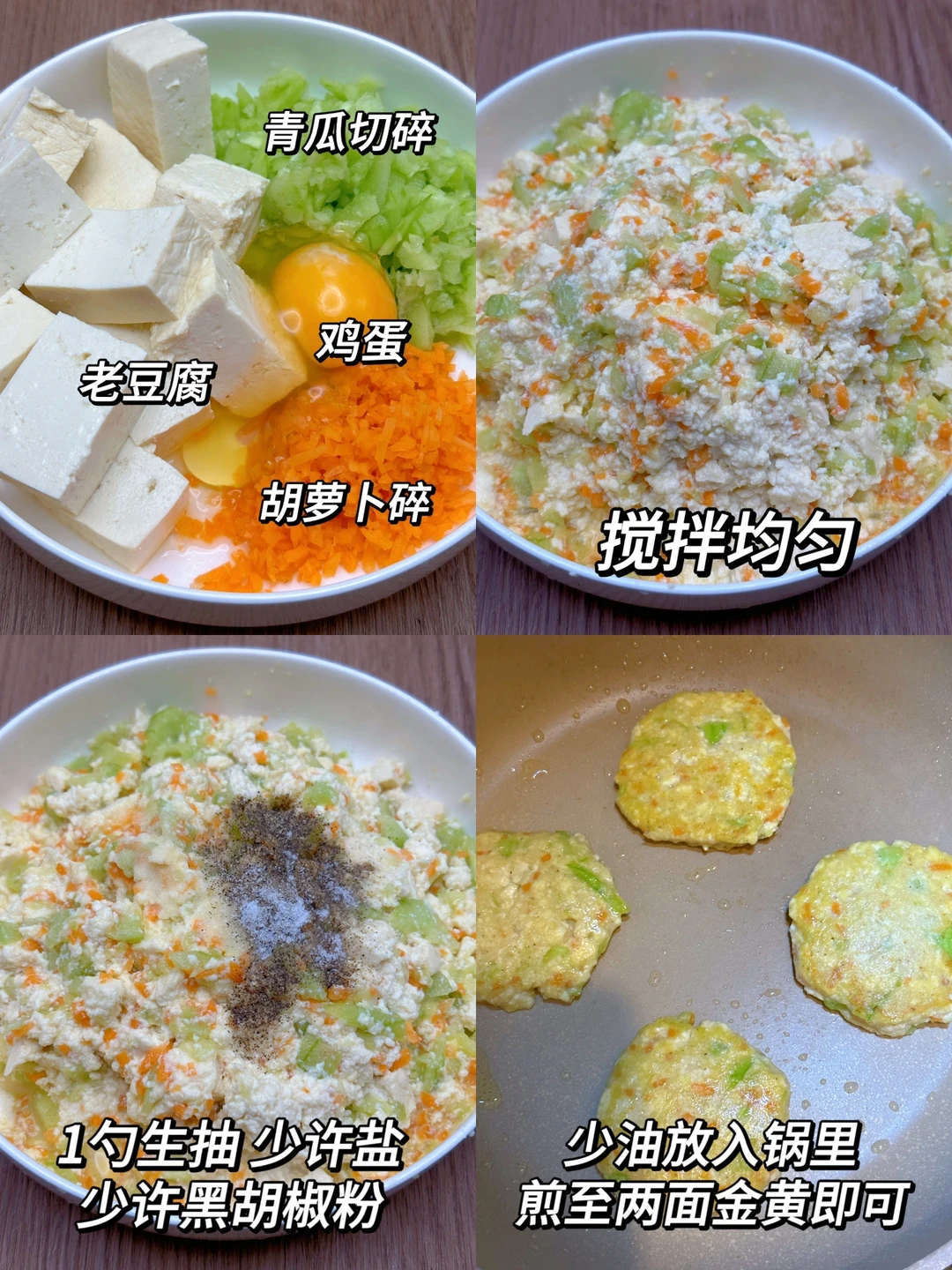 低卡低脂的减脂餐,所有减肥的姐妹们都去吃这个蔬菜豆腐饼,低脂高蛋白!外焦里嫩,巨美味!一个饼才20大卡,一份食材不小心做了17个,完全吃不完,饱腹感满满,简单易做,姐妹们赶紧试试吧! 🥗食材:豆腐、鸡蛋、胡萝卜、黄瓜 🥘做法:如图所示~ 煎的时候就闻到豆腐的香味啦~这个豆腐饼直接吃,蘸啥酱料都好吃,富含优质蛋白质,低卡低脂!减脂期可以放心吃,当午餐或晚餐,营养又健康,姐妹们都试试吧~