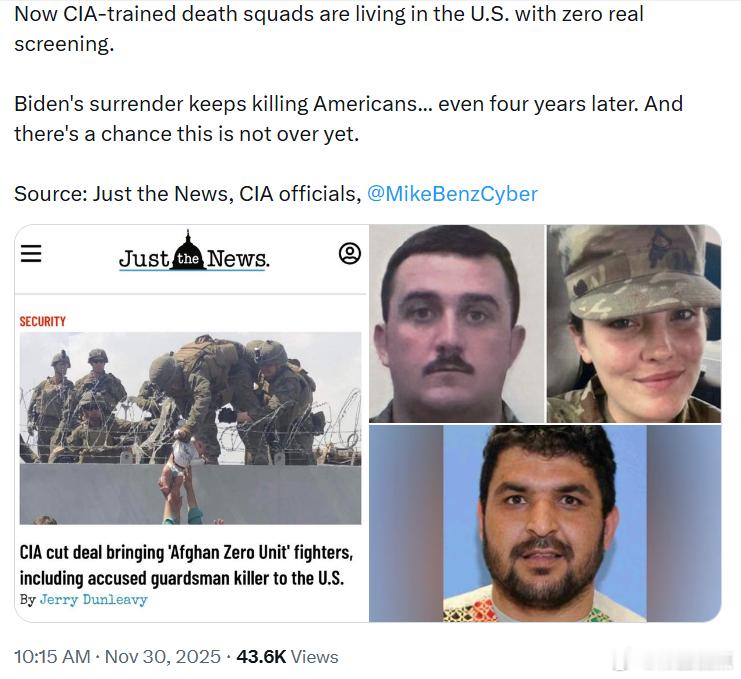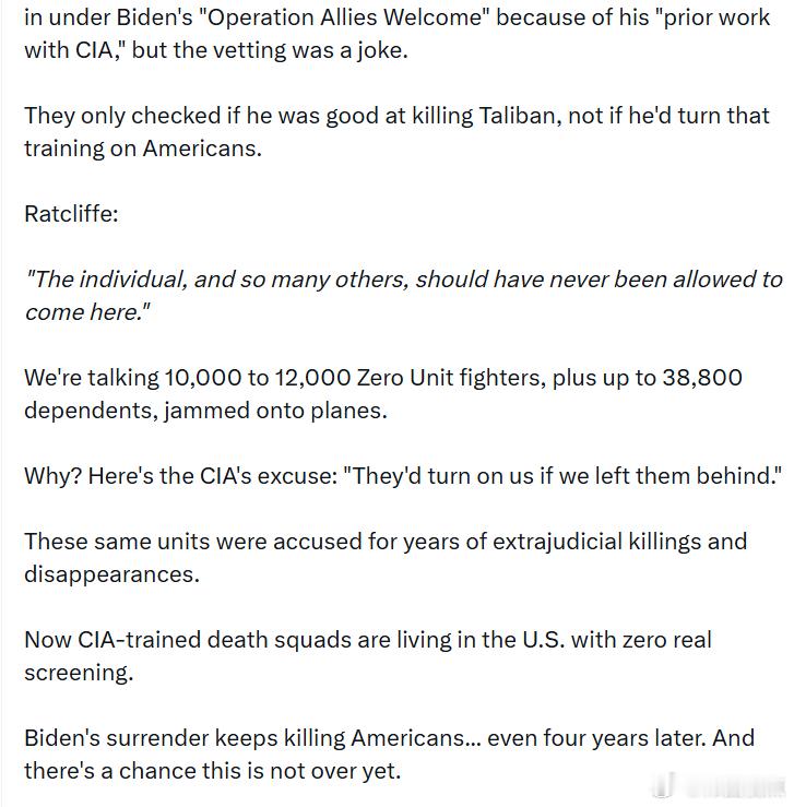 美中央情报局将阿富汗死亡小队空运到美国,现在他们正在杀害美国人。在拜灯匆忙从阿富汗撤军期间,中央情报局达成了一项秘密协议,将数千名精锐阿富汗“零单位”突击队员空运到美国。他们的数万名家庭成员也随他们一起被空运进来。事实证明,这是一个不断给予的特洛伊礼物。其中一名由中央情报局训练的阿富汗人从西雅图开车横跨全国,在华盛顿特区一家酒店外等待,然后伏击了两名执行犯罪巡逻任务的国民警卫队士兵。他冷血杀害了20岁的专家莎拉·贝克斯特罗姆,并重伤了安德鲁·沃尔夫上士。前国家情报总监约翰·拉特克利夫猛烈抨击了整件事:拉坎瓦尔是在拜灯的“欢迎盟友行动”下被空运进来的,因为他“之前与中央情报局合作”,但婶查简直是个笑话。他们只检查他是否擅长杀S塔利班,而没有检查他是否会将这种训练转向美国人。拉特克利夫说:“这名个人,以及许多其他人,本不应该被允许来到这里。”我们说的是1万至1.2万名零单位战士,外加多达3.88万名家属,被塞上飞机。为什么?中央情报局的借口是:“如果我们把他们扔下,他们会反过来对付我们。”现在,由中央情报局训练的死亡小队在美国生活,没有进行真正筛选。拜灯的投降甚至在四年后仍在S害美国人,而且还有可能这还没结束。