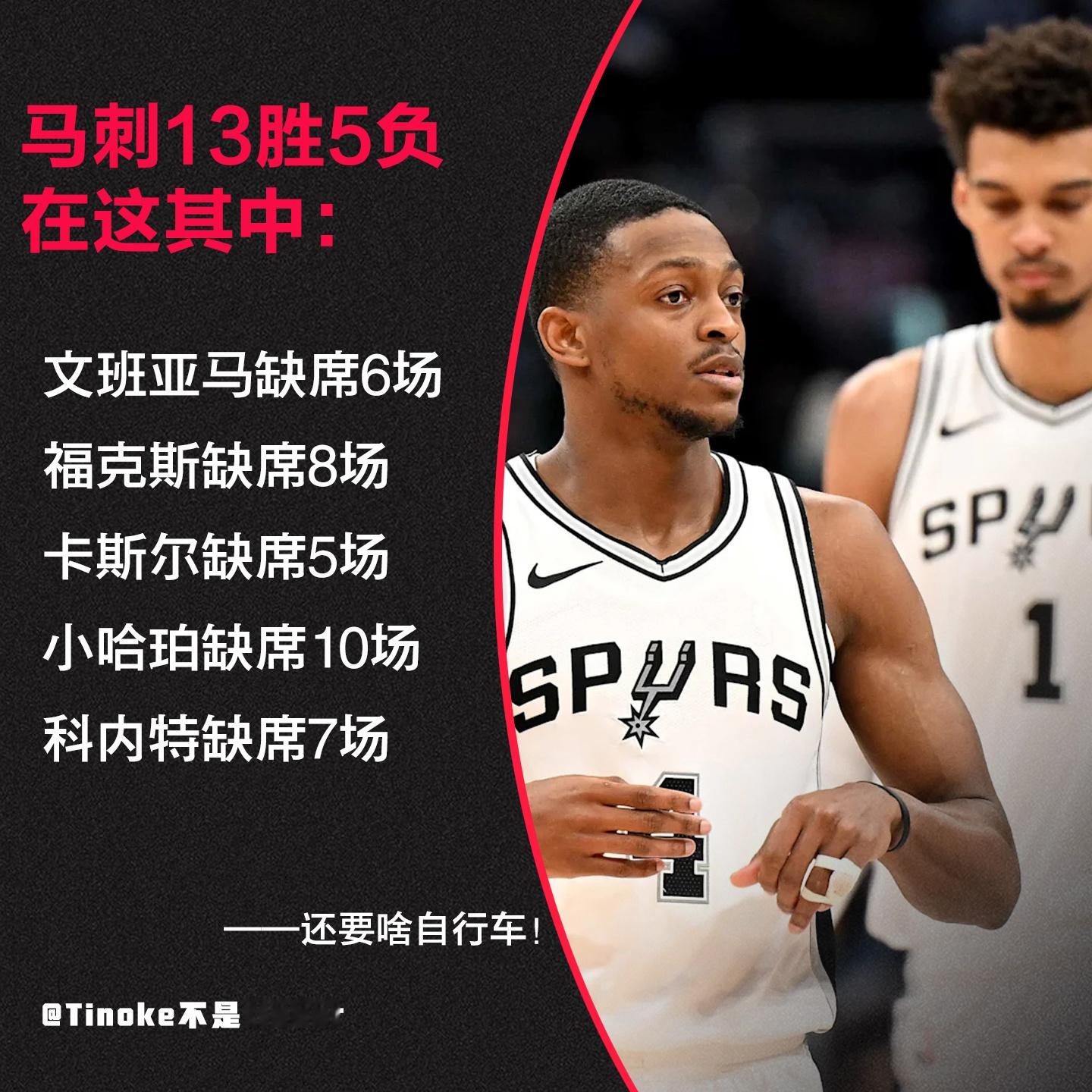 马刺开季13胜5负西部第5,我看到还有朋友对这个战绩和排名不满意,当然有一些比赛不该输(对吧米奇?比如打勇士的某场甚至是某两场)可其实开赛到现在,马刺还没有哪怕一场阵容齐整过,福克斯-卡斯尔-文班亚马-小哈珀的这个组合还没有一起出现在报名名单上过哪怕一次。但即便是这样的客观条件下,马刺依旧能跟约基奇穆雷都在的掘金打对攻且逆转赢球,这就已经证明了这支马刺现在有了跟前几年不一样的气质。我们是以一个敲击101下石头为口号的球队,在球队有这样的改变之下,还要啥自行车?所以明天打背靠背的森林狼,赢几分兄弟们?nba超话陪聊官马刺