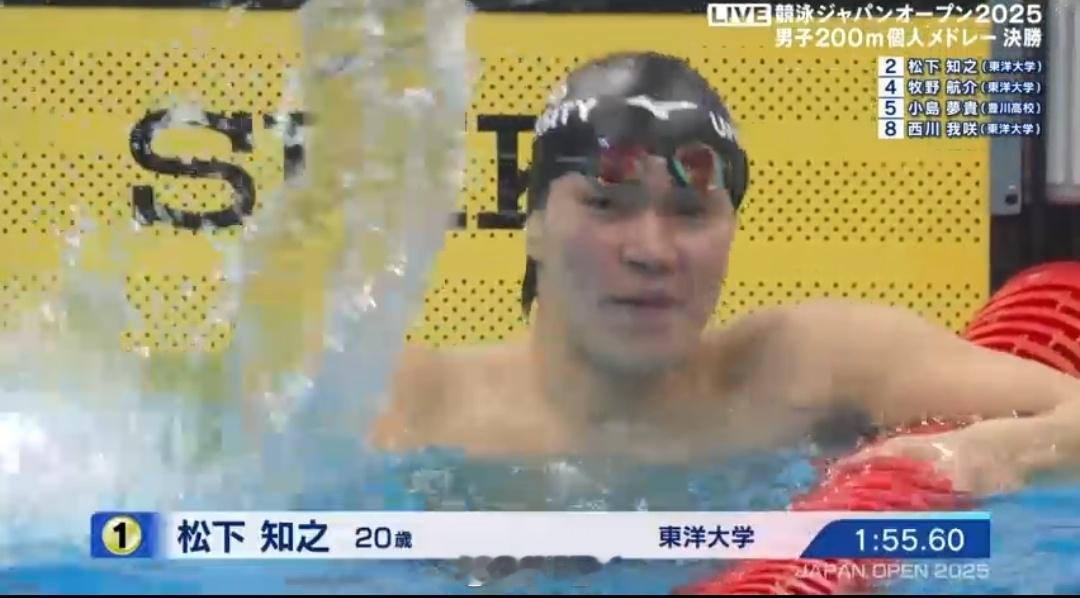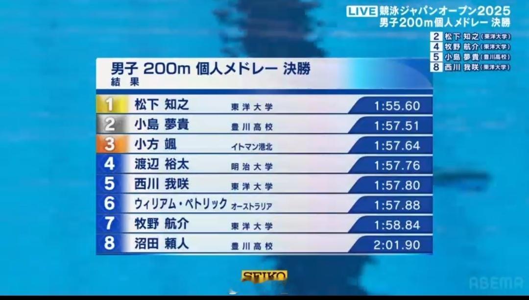 日本游泳公开赛 男200混决赛松下知之 1:55.60 PB 小岛梦贵 1:57.51小方飒 1:57.64前六名全都游进1:58以内!