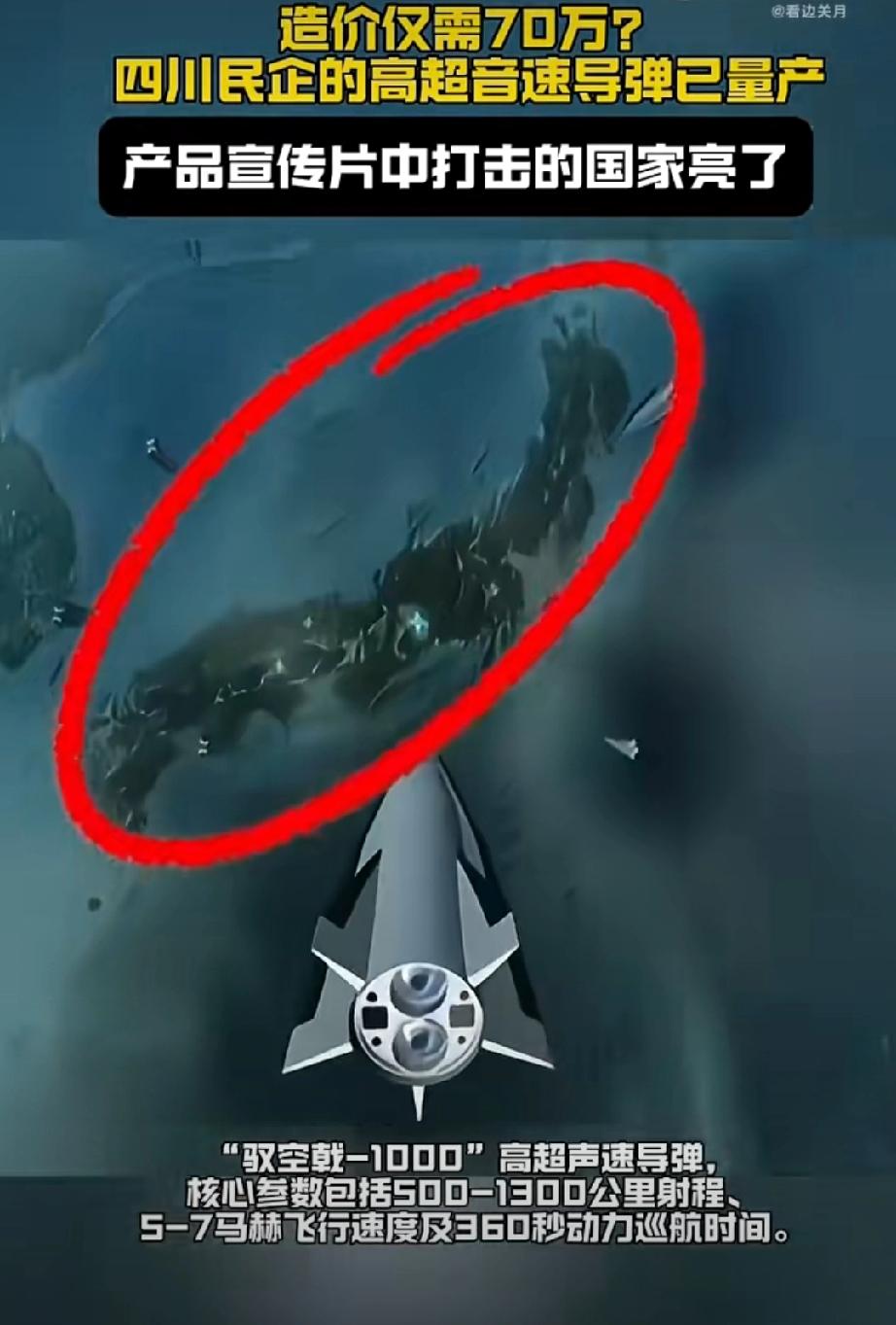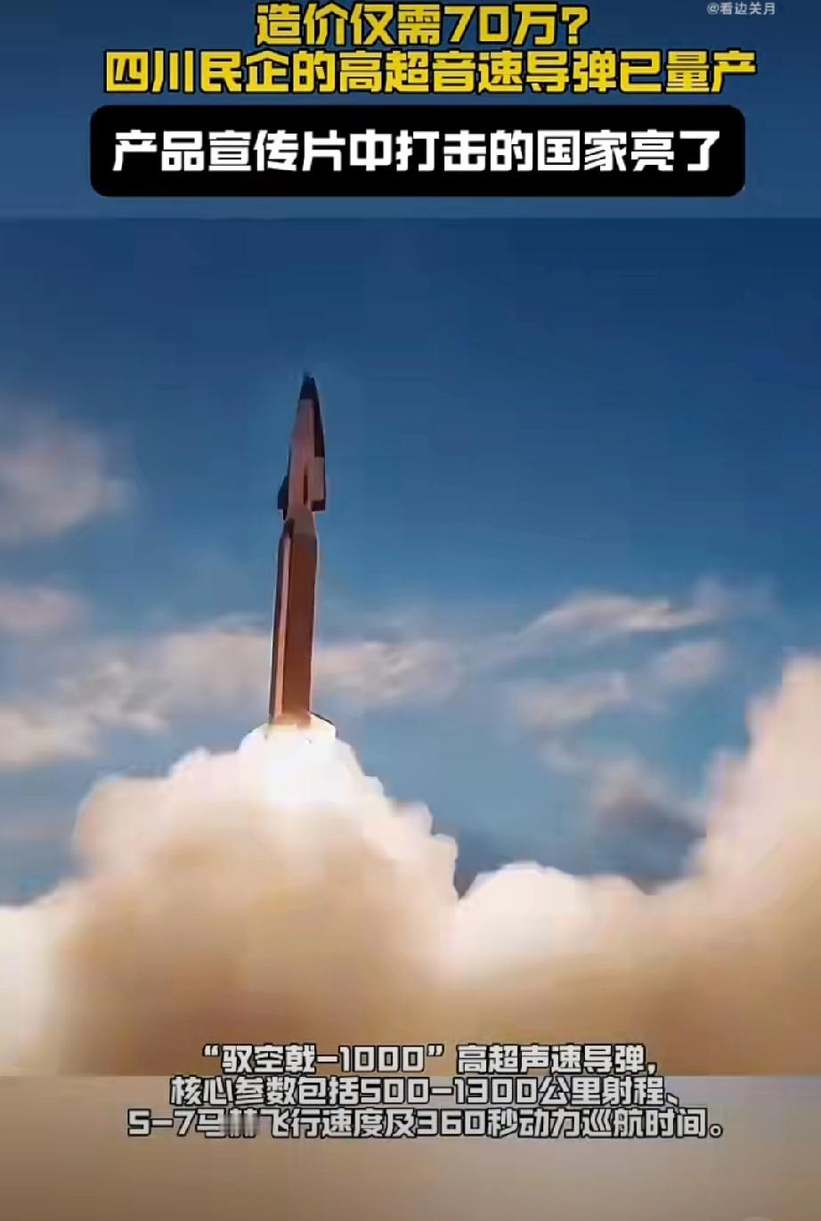 川军血脉觉醒!四川民企“手搓”高超导弹量产,70万白菜价专治不服…… 四川民营企业这波操作,直接把川军的血性和智慧拉满——居然把高超音速导弹给造出来了,还直接量产了! 这款叫“驭空戟-1000”的导弹,速度飙到5-7马赫,1300公里射程说打就打,米级精度指哪打哪,连航母编队都能精准锁定! 最绝的是成本,网传才70万,就算官方说没这么低,也只是传统导弹的十分之一,简直是把高端武器做成了“白菜价”! 更解气的是宣传片,直接模拟打击航母和某岛国全境,这威慑力直接拉满,谁看了不说一句“干得漂亮”! 以前总觉得高超导弹是“国家队”专属,没想到川籍民企也能支棱起来,这就是“藏军于民”的底气啊!真是“巴适又霸气”[狗头]