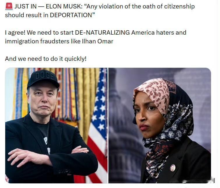 埃隆·马斯克:“任何违反入籍誓词的行为都应当导致驱逐出境。” 美国需要开始剥夺那些美国仇恨者和移民欺诈者(如伊尔汗·奥马尔)的公民身份。 而且需要尽快行动!