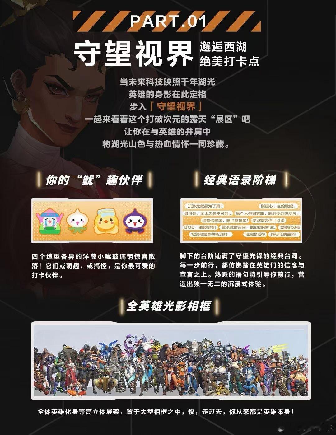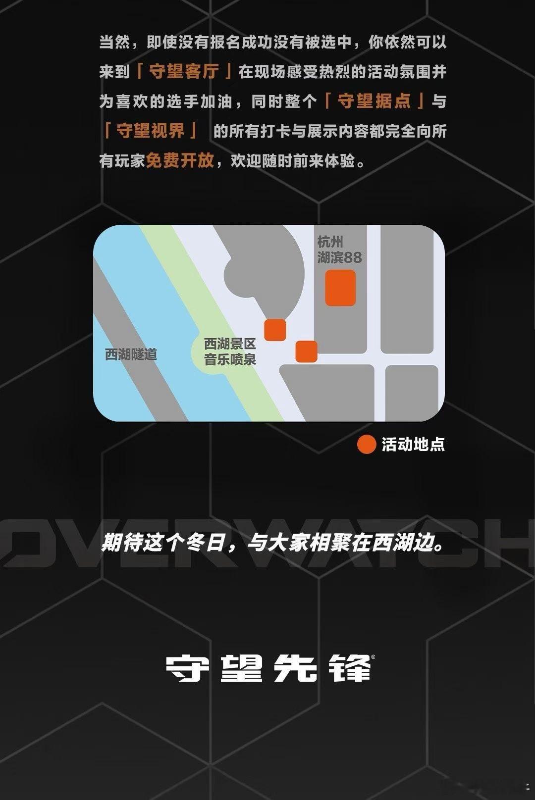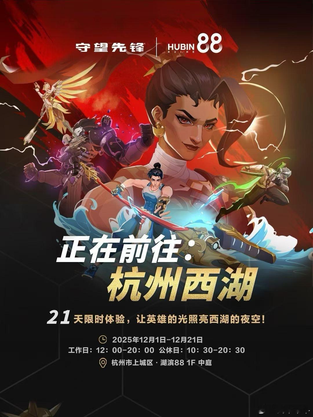 守望先锋集结杭城,开启为期21天的沉浸式主题体验。步入「守望视界」,与全英雄立牌并肩,在西湖边定格高光瞬间; 沉浸「守望据点」,英雄视觉全域覆盖,还能欣赏守望优质同人作品; 玩转「守望客厅」,参与互动打卡领取限定周边,更有“渣客女王”雕像国内首展亮相。 连续三周,周末主题派对轮番上演:新英雄“斩仇”现身、战队签售、手作工坊、圣诞茶话会……精彩不间断。12月,西湖湖畔,我们在湖滨88中庭和暴雪杭州西湖店等你!
