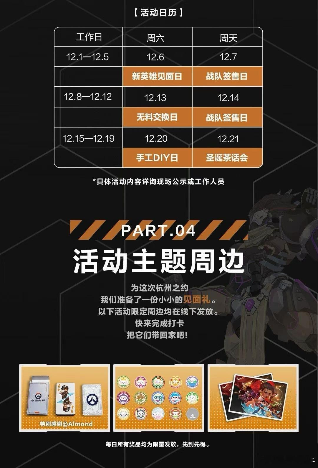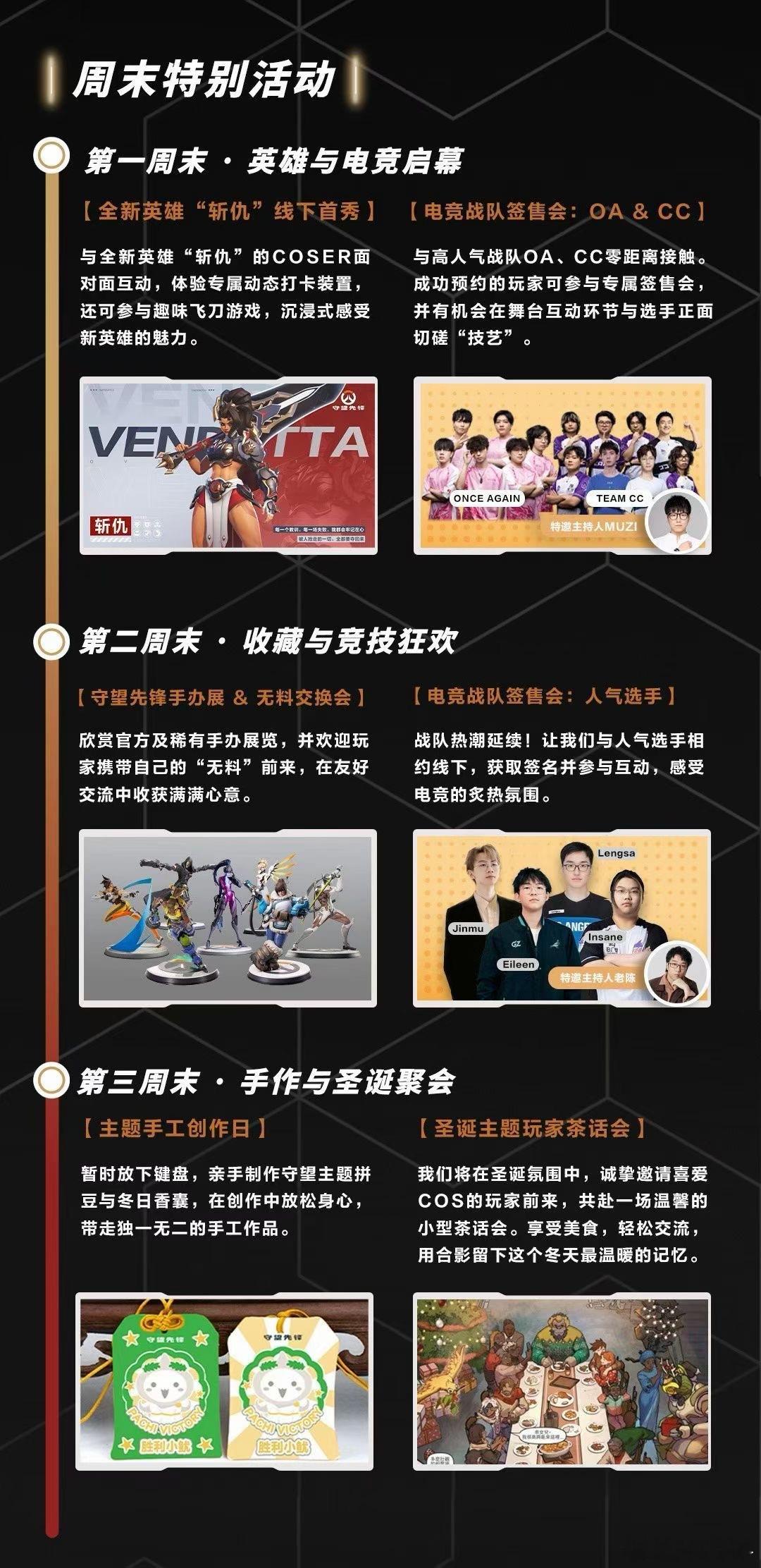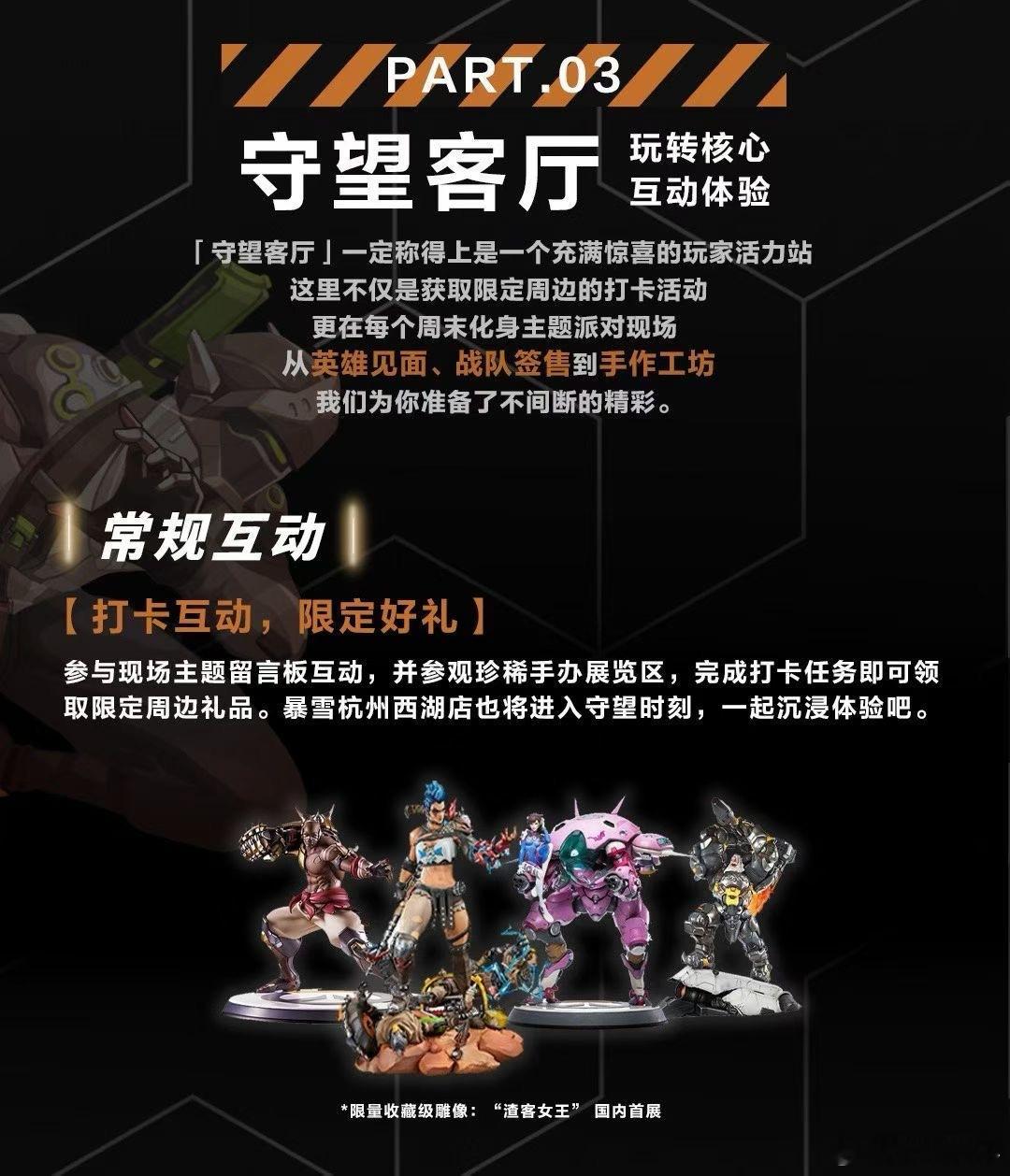 守望先锋集结杭城,开启为期21天的沉浸式主题体验。步入「守望视界」,与全英雄立牌并肩,在西湖边定格高光瞬间; 沉浸「守望据点」,英雄视觉全域覆盖,还能欣赏守望优质同人作品; 玩转「守望客厅」,参与互动打卡领取限定周边,更有“渣客女王”雕像国内首展亮相。 连续三周,周末主题派对轮番上演:新英雄“斩仇”现身、战队签售、手作工坊、圣诞茶话会……精彩不间断。12月,西湖湖畔,我们在湖滨88中庭和暴雪杭州西湖店等你!