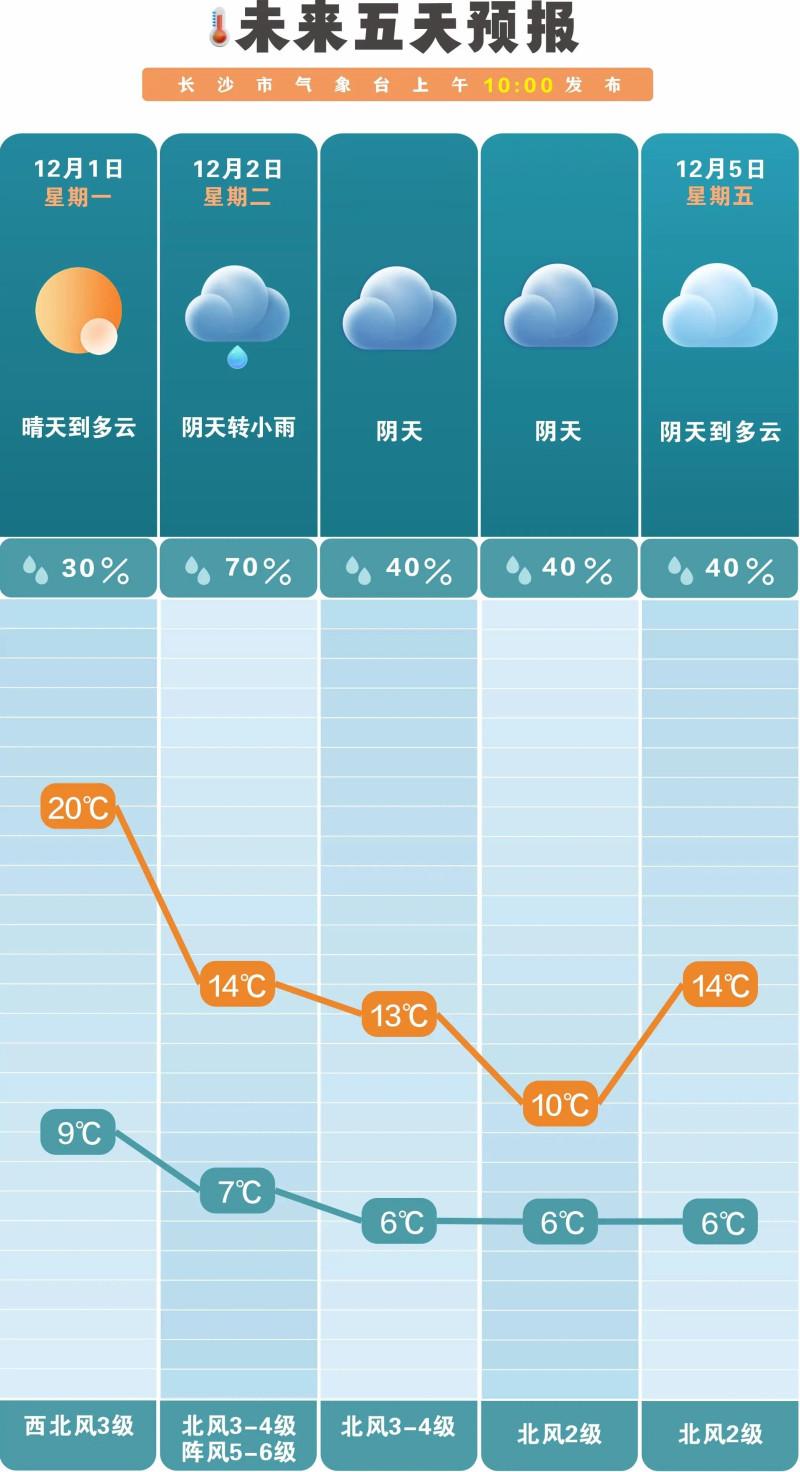 根据长沙市气象台预报,12月伊始(12月1日)尚维持晴天到多云的格局,最高气温可达20℃。然而,从下周二(12月2日)开始,天气形势急转直下,将转为阴天并有小雨光临,降水概率达70%。同时,气温将出现明显下跌,最高气温骤降至14℃,最低气温仅7℃。