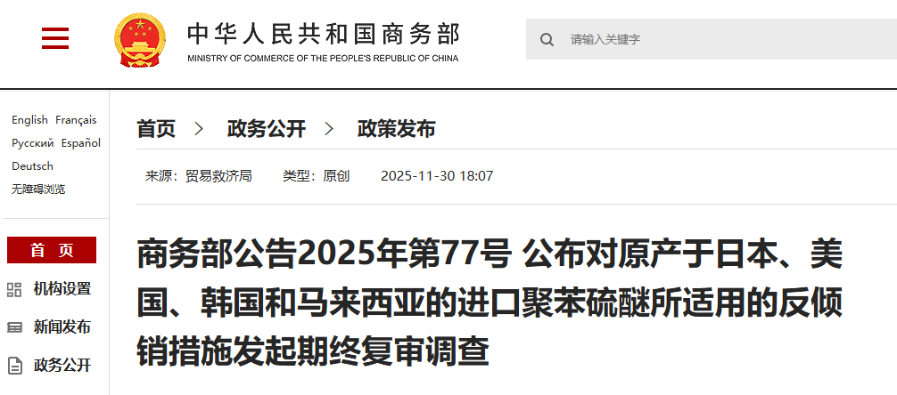 #商务部对日美等四国进口聚苯硫醚发起反倾销复审#【商务部公告2025年第77号 公布对原产于日本、美国、韩国和马来西亚的进口聚苯硫醚所适用的反倾销措施发起期终复审调查】2020年11月30日,商务部发布2020年第53号公告,决定自2020年12月1日起,对原产于日本、美国、韩国和马来西亚的进口聚苯硫醚征收反倾销税,税率为23.3%—220.9%,其中,日本公司25.2%—69.1%,美国公司214.1%—220.9%,韩国公司26.4%—46.8%,马来西亚公司23.3%—40.5%。措施实施期限为5年。2021年10月28日,商务部发布2021年第34号公告,决定由日本出光复合材料株式会社继承出光狮王塑料株式会社在聚苯硫醚反倾销措施中所适用的税率及其他权利义务。2022年10月14日,商务部发布2022年第26号公告,决定由韩国HDC聚合物株式会社继承SK化工株式会社在聚苯硫醚反倾销措施中所适用的税率及其他权利义务。2025年9月8日,商务部收到浙江新和成特种材料有限公司代表中国聚苯硫醚产业提交的反倾销措施期终复审申请书。申请人主张,如果终止反倾销措施,原产于日本、美国、韩国和马来西亚的进口聚苯硫醚的倾销可能继续或再度发生,对中国产业造成的损害可能继续或再度发生,请求商务部对原产于日本、美国、韩国和马来西亚的进口聚苯硫醚反倾销措施进行期终复审调查,并维持对原产于日本、美国、韩国和马来西亚的进口聚苯硫醚实施的反倾销措施。恩骅力新和成工程材料(浙江)有限公司支持申请。根据《中华人民共和国反倾销条例》有关规定,商务部对申请人资格、被调查产品和中国同类产品有关情况、反倾销措施实施期间被调查产品进口情况、倾销继续或再度发生的可能性、损害继续或再度发生的可能性及相关证据等进行了审查。现有证据表明,申请人符合《中华人民共和国反倾销条例》第十一条、第十三条和第十七条关于产业及产业代表性的规定,有资格代表中国聚苯硫醚产业提出申请。调查机关认为,申请人的主张以及所提交的表面证据符合期终复审立案的要求。根据《中华人民共和国反倾销条例》第四十八条规定,商务部决定自2025年12月1日起,对原产于日本、美国、韩国和马来西亚的进口聚苯硫醚所适用的反倾销措施进行期终复审调查。现将有关事项公告如下:一、继续实施反倾销措施根据商务部建议,国务院关税税则委员会决定,在反倾销措施期终复审调查期间,对原产于日本、美国、韩国和马来西亚的进口聚苯硫醚继续按照商务部2020年第53号公告、2021年第34号公告和2022年第26号公告公布的征税范围和税率征收反倾销税。对各公司征收的反倾销税税率如下:日本公司:1.东丽株式会社 26.9%(Toray Industries, Inc.)2.DIC株式会社 27.3%(DIC Corporation)3.宝理塑料株式会社 25.2%(POLYPLASTICS CO., LTD.)4.东曹株式会社 25.6%(Tosoh Corporation)5.出光复合材料株式会社 33.6%(IDEMITSU FINE COMPOSITES CO., LTD.)6.住友电木株式会社 34.5%(Sumitomo Bakelite Co., Ltd.)7.其他日本公司 69.1%美国公司:1.苏威特种聚合物美国有限公司 214.1%(Solvay Specialty Polymers USA, LLC)2.富特朗实业有限公司 220.9%(Fortron Industries LLC)3.其他美国公司 220.9%韩国公司:1.东丽尖端素材株式会社 26.4%(Toray Advanced Materials Korea Inc.)2.HDC聚合物株式会社 32.7%(HDC POLYALL Co.,Ltd.)3.其他韩国公司 46.8%马来西亚公司:1.宝理塑料(亚太)公司 23.3%(Polyplastics Asia Pacific Sdn. Bhd.)2.迪爱生复合物(马来西亚)有限公司 40.5%(DIC Compounds(Malaysia) Sdn. Bhd.)3.其他马来西亚公司 40.5%二、复审调查期本次复审的倾销调查期为2024年7月1日至2025年6月30日,产业损害调查期为2021年1月1日至2025年6月30日。三、复审调查产品范围复审产品范围是原反倾销措施所适用的产品,与商务部2020年第53号公告的产品范围一致。具体如下:被调查产品名称:聚苯硫醚,全称聚苯基硫醚,或聚亚苯基硫醚英文名称:Polyphenylene sulfide,简称为PPS产品描述:聚苯硫醚是分子链中带有苯硫基(分子式为C6H4S)的高性能热塑性树脂及其组合物,无论是否经过改性及/或是否混合、添加玻璃纤维、矿粉等填充物和助剂,具有耐高温、耐腐蚀、耐辐射、阻燃、电绝缘等优良性能。主要用途:聚苯硫醚可用于纤维纺丝、制膜、涂料、注塑、挤塑、合金等,产品广泛应用在纺织、汽车、电子电器、机械、石油、化工、航天航空等领域。该产品归在《中华人民共和国进出口税则》:39119000。该税则号项下聚苯硫醚以外的其他产品不在本次调查范围之内。四、复审内容本次复审调查的内容为:如果终止对原产于日本、美国、韩国和马来西亚的进口聚苯硫醚实施的反倾销措施,是否可能导致倾销和损害继续或再度发生。五、登记参加调查利害关系方可于本公告发布之日起20日内,向商务部贸易救济调查局登记参加本次反倾销期终复审调查。参加调查的利害关系方应根据《登记参加调查的参考格式》提供基本身份信息、向中国出口或进口本案被调查产品的数量及金额、生产和销售同类产品的数量及金额以及关联情况等说明材料。《登记参加调查的参考格式》可在商务部网站贸易救济调查局子网站下载。利害关系方登记参加本次反倾销调查,应通过“贸易救济调查信息化平台”(网页链接)提交电子版本,并根据商务部的要求,同时提交书面版本。电子版本和书面版本内容应相同,格式应保持一致。本公告所称的利害关系方是指《中华人民共和国反倾销条例》第十