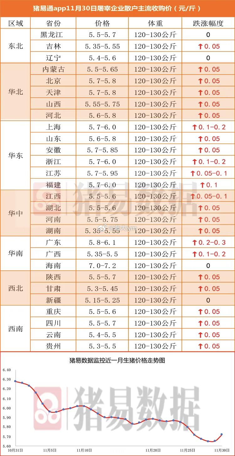 据猪易数据监测数据显示,2025年11月30日标准体重生猪平均价格为11.44元/公斤,较昨日猪价上涨0.14元/公斤,涨幅为1.24%,同比24年同期16.44元/公斤下跌5.00元/公斤,跌幅为30.41%生猪期货