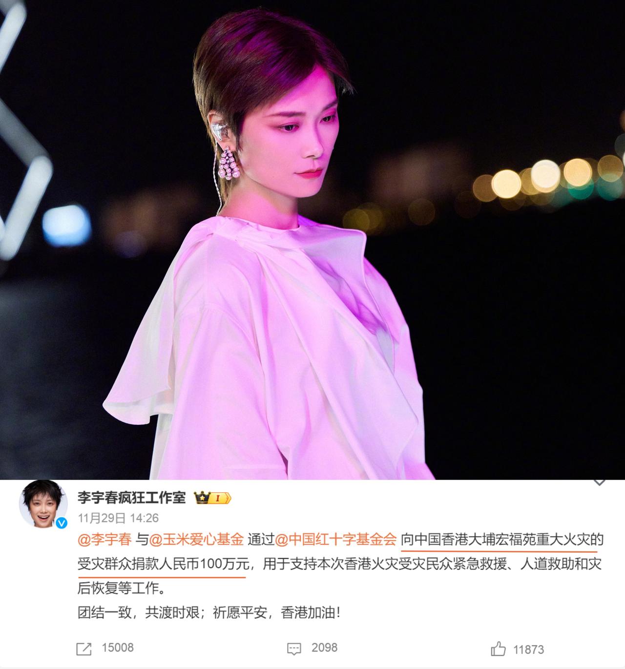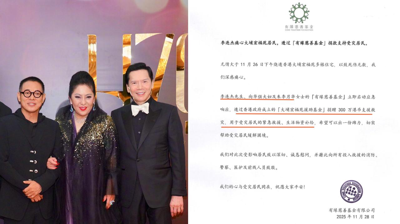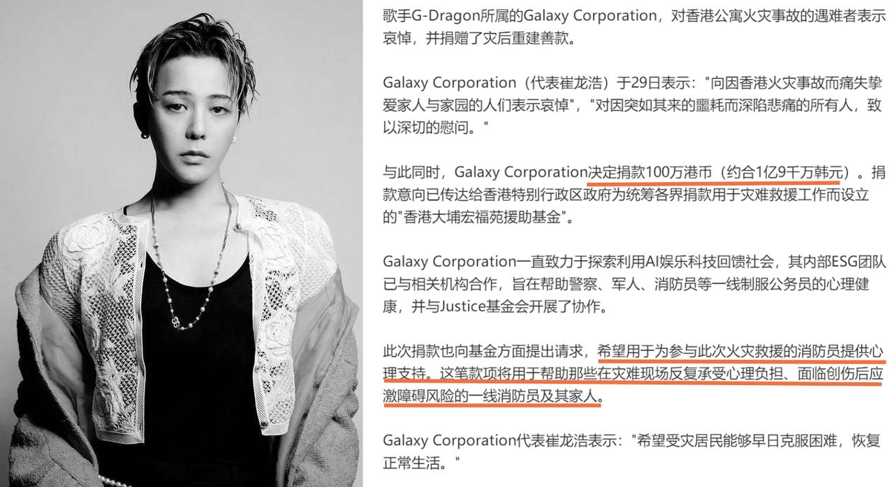 香港大埔灾后第5天,又有多位艺人为受灾民众捐款。 马伊琍、马丽、李宇春、李现、白敬亭、刘雨昕、张碧晨、乔杉等都捐出了100万人民币。 此外,李连杰也联合向太、向华强和朱李月华,通过大埔宏福苑援助基金,捐赠300万港币。 到港参加MAMA颁奖礼的韩星权志龙,也捐赠了100万港币,并通过基金会阐述了捐款的宗旨,“希望借此传递共同恢复的灾后信息,展现跨越国界的团结精神。” 权志龙方面还提出请求,希望将这笔善款用于为消防员提供心理支持,“帮助那些在灾难现场反复承受心理负担、面临创伤后应激障碍风险的一线消防员及其家人。” 据不完全统计,已有超过100位艺人为香港大埔火灾救援捐款,总金额近1亿,其中百万级个人捐赠是主流。