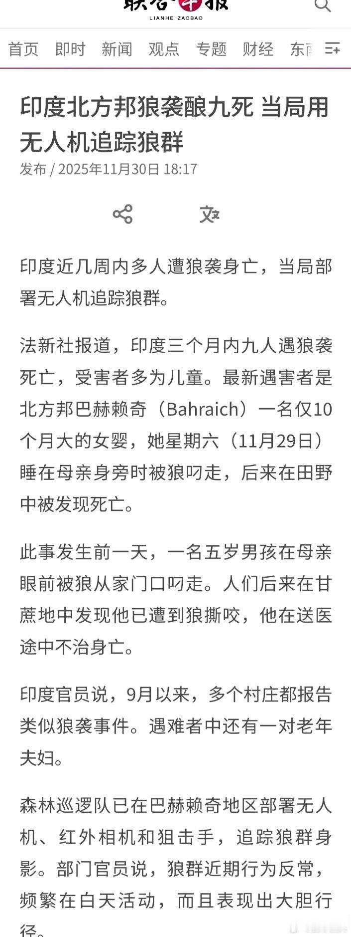 寰球镜头印度近几周内多人遭狼袭身亡,当局部署无人机追踪狼群。法新社报道,印度三个月内九人遇狼袭死亡,受害者多为儿童。最新遇害者是北方邦巴赫赖奇(Bahraich)一名仅10个月大的女婴,她星期六(11月29日)睡在母亲身旁时被狼叼走,后来在田野中被发现死亡。海外新鲜事
