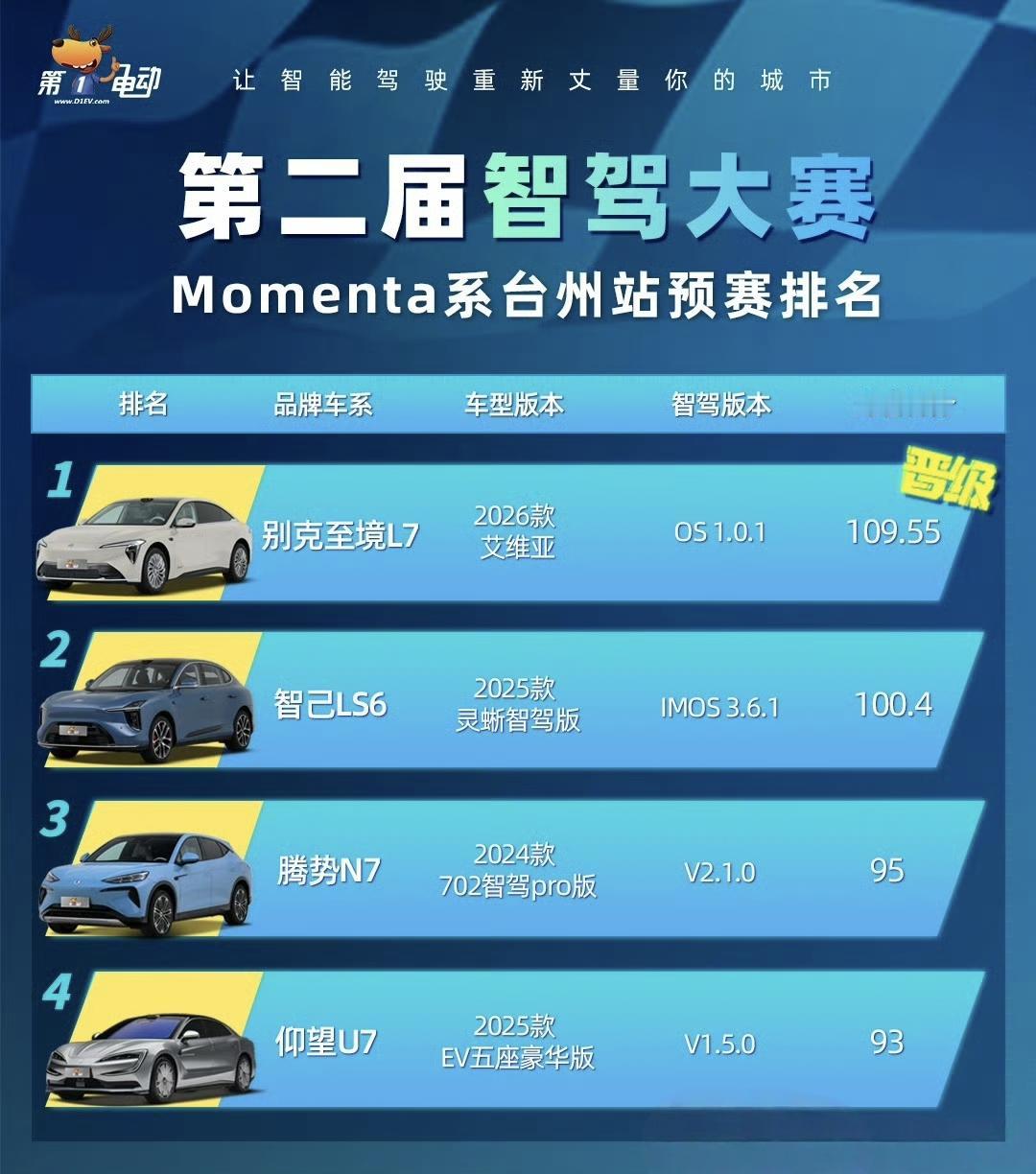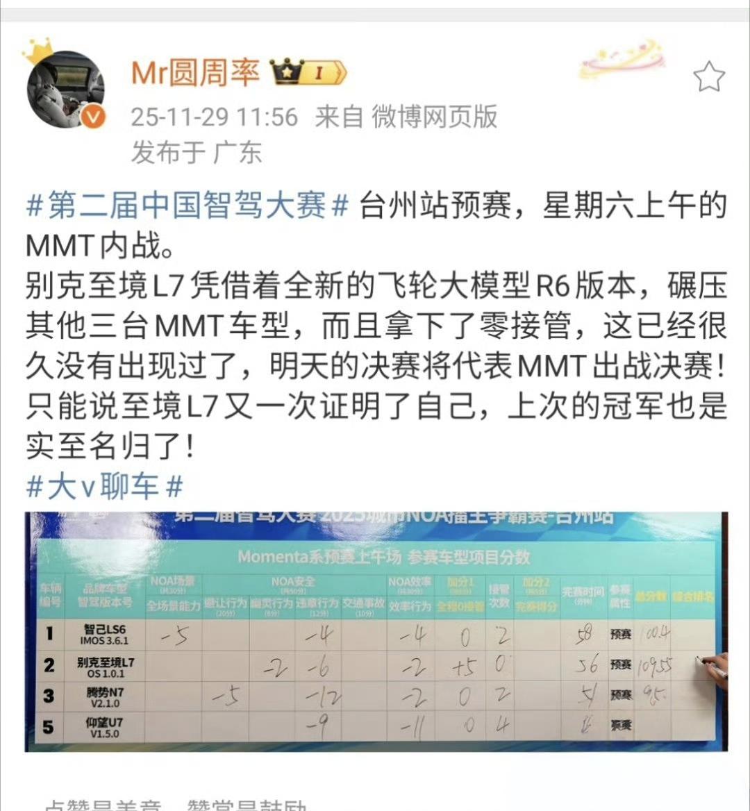 第二届中国智驾大赛 前方来报@飞走的云520 @Mr圆周率 ,MMT组比赛,别克至境L7遥遥领先,零接管拿下比赛,mmt R6飞轮大模型立功了。 明天至境L7将会代表mmt出战决赛,上次宁波站比赛冠军不是盖的。 【来自懂车帝车友圈】