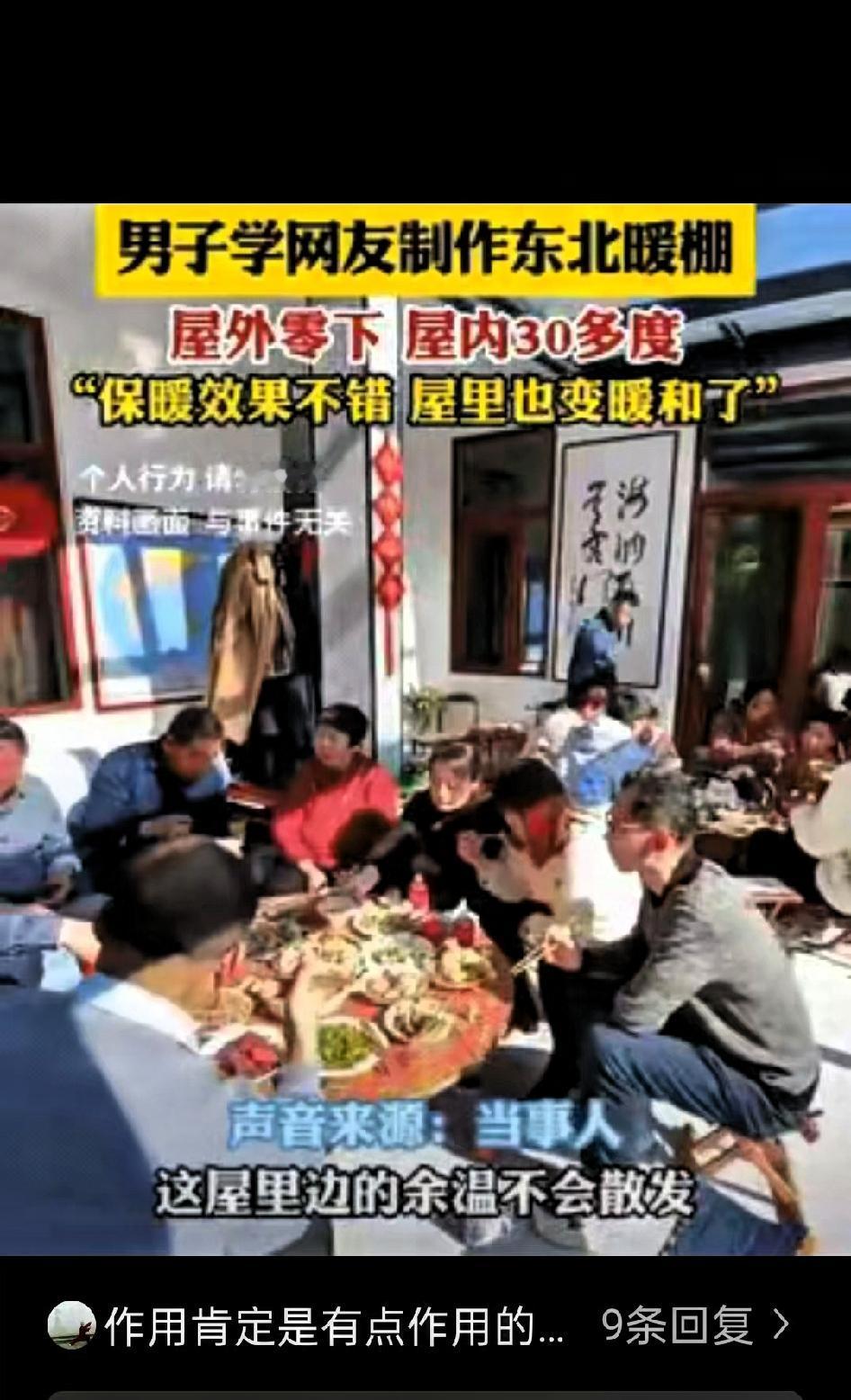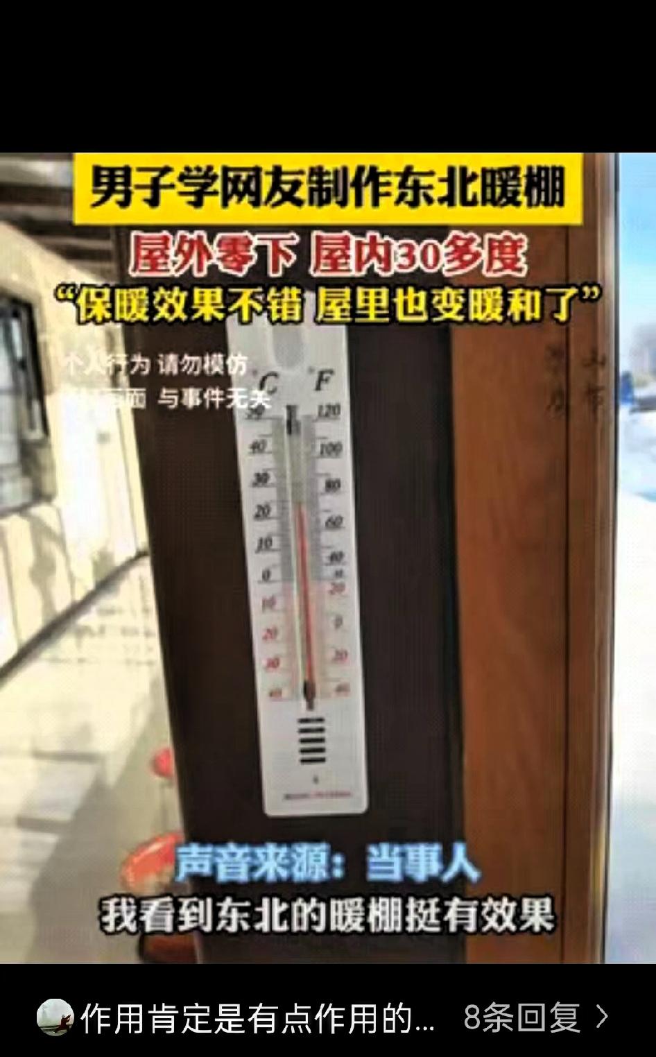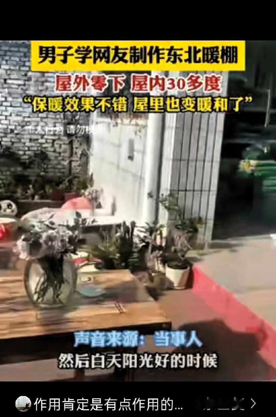“太有头脑了”!河北石家庄,男子为了省钱应对零下天气,竟然花1000多,学网友制作东北暖棚 用简单有效的方式解决了冬季取暖难题,引发广泛关注与认可。 老人畏寒但舍不得长时间开空调,使用煤气取暖又存在安全隐患,这让男子十分牵挂。一次网上浏览时,他看到东北老乡搭建阳光暖棚取暖的视频,棚内无需耗电就能保持适宜温度,便决定借鉴这一方法。 随后,男子购置材料并动手搭建。起初邻居对此并不看好,认为是浪费钱,没想到暖棚搭建完成后效果显著。 由于房屋朝向正南,阳光能充分照射进棚内,白天棚内温度最高可达38度,与之相连的室内温度也能稳定在22度左右,老人在室内无需穿着厚重棉衣即可舒适活动。 到了夜间,在棚外覆盖一层布或旧棉被就能起到良好的保温效果,清晨棚内温度仍能保持在十七八度,大大减少了电热毯等取暖设备的使用。 这笔1000多元的投入性价比很高,后续维护成本极低,即便塑料布老化损坏,更换一块也只需几十元,相比每月数百元的空调电费节省不少开支。网友们纷纷表示认可,认为这种接地气的“土办法”切实解决了问题。 男子的做法不仅体现了生活智慧,更彰显了质朴的孝心。他没有强行改变老人的生活习惯,而是通过优化环境满足老人的需求,这种尊重与理解的态度尤为可贵。生活中许多难题,往往不需要复杂的解决方案,只要肯用心思考,就能找到既实用又经济的办法。