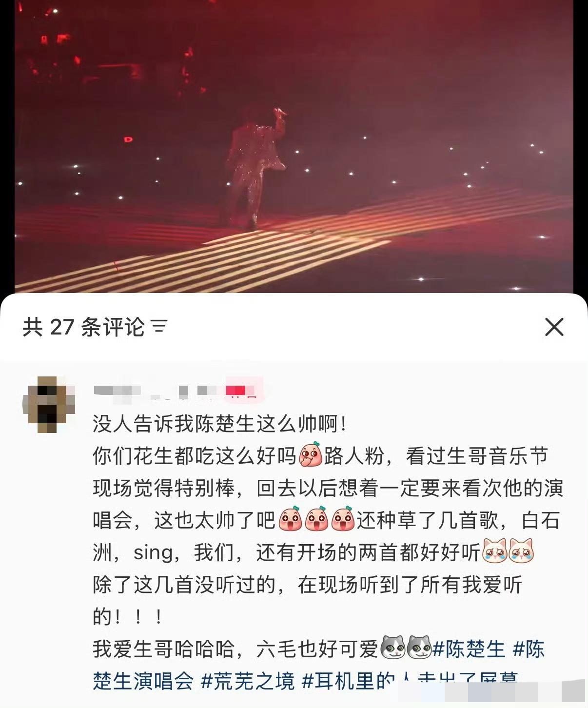 每次生哥演唱会后最喜欢看到的就是路人们的评价! 第一类似“非粉也很震撼啊”这样的话,路人的心声是真实的感受。 第二就是“没人告诉我陈楚生这么帅啊”、“太蛊惑人”…,嗯,生哥就是这么帅。 第三类评论“不愧是歌王”、“太好听了”再次证明了他的实力。 第四就是“入坑了”,哈哈哈。