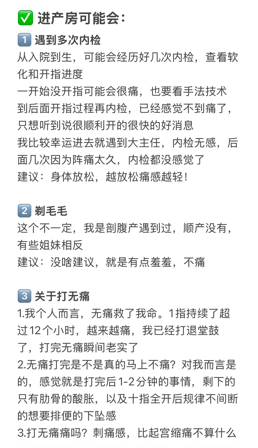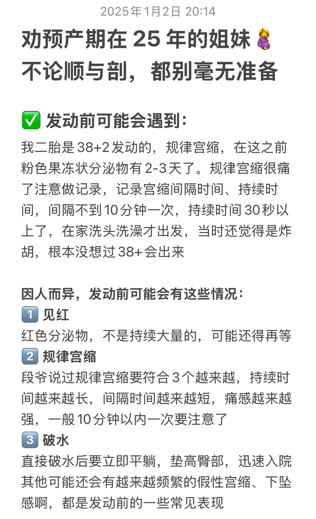 生活需要分享欲 预产期在25年生🐍宝宝的姐妹们,生宝宝前不能毫无准备,都但是也不用特别紧张,着急! 看看临产前、产程中、产后可能会遇到什么,以及需要怎么做吧! ①临产可能出现什么情况 ②顺产过程可能会遇到的情况 ③进产房宝宝和妈妈需要带什么 ④产后回病房需要做什么 ⑤产后月子里的注意事项 如果预产期在春节期间,过年可能面临大白们休假值班,以及护工月嫂人手紧缺,一定要提前做计划。并且过年期间亲友们来往频繁,注意照顾好宝宝和产后妈妈,减少接触。 ㊗️孕妈姐妹们怀孕、生宝宝顺顺溜溜!